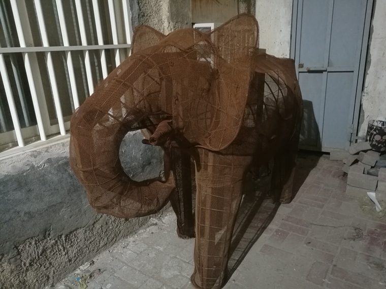 وأوضح بأن المجسمات تصنع من الحديد والشبك وتغطى بالإسمنت لتتماسك، مبيناً أنه بدأ بالعمل الخارجي منذ عيد الأضحى.