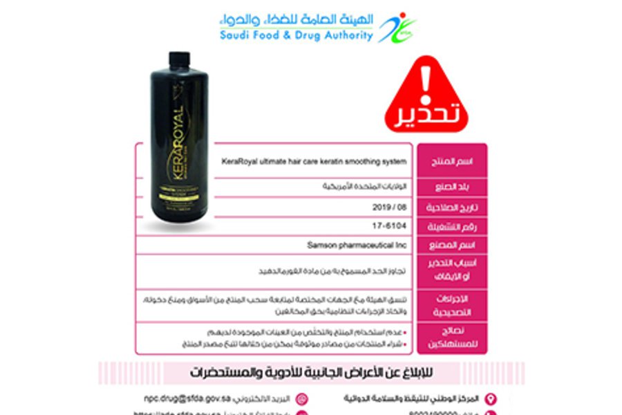 حذَّرت الهيئة العامة للغذاء والدواء من 4 منتجات لفرد الشعر؛ لاحتوائها على نسبة عالية من مادة ”فورمالدهيد“.