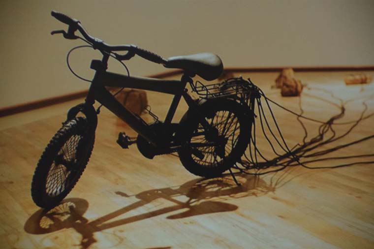 ولفت إلى أن فكرته كانت مبنية بشكل كبير على الصوت موضحا أن أكثر أعماله التي عمل عليها تكون مرافقة ”لعمل تركيبي“ معين حيث قام بعرض ”الدراجة“ مع الفيديو ولكن بطريق مختلفة حيث استبدل ”العلب بالأحجار“ في رمزية إلى كون العالم مختلف الان عن سابقه، عرض العمل عام 2014 في ”متحف الفنون“، بالبحرين.