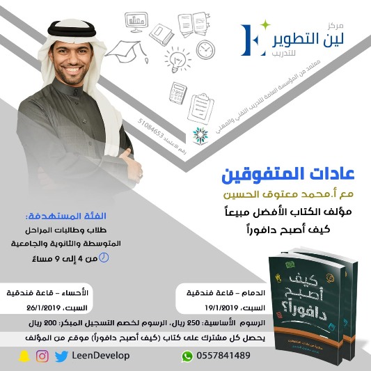 ينظم مركز لين التطوير دورة «عادات المتفوقين» لطلاب وطالبات المرحلة المتوسطة والثانوية والجامعية، يقدمها مؤلف كتاب «كيف أصبح دافورا» محمد الحسين.