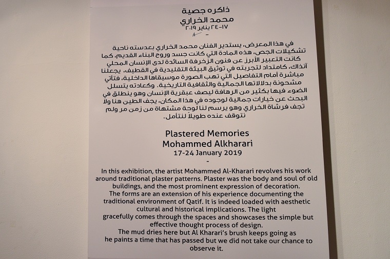 وبين بأن عنوان المعرض والذي يحمل اسم «ذاكرة جصية» يُعنى بتنفّس عبق الماضي من خلال مادة «الجص» المستخدمة في عملية البناء، وصنع فسحة بصرية للمتلقي لاستنطاقها من جوانب عديدة.