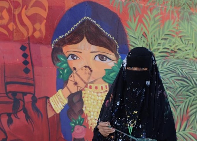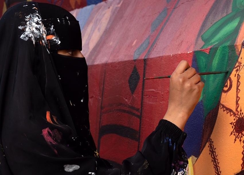 تشكيلية بـ ”عباءة الرأس“ تبهر زوار ”جدارية الوطن“ برسوماتها