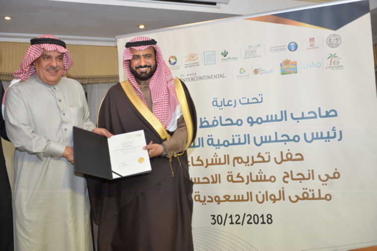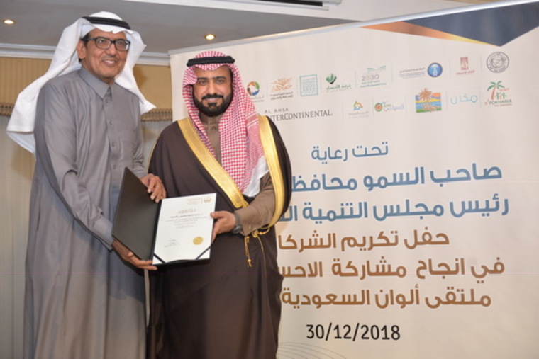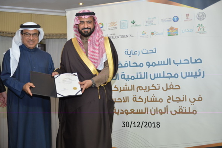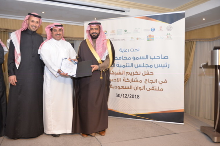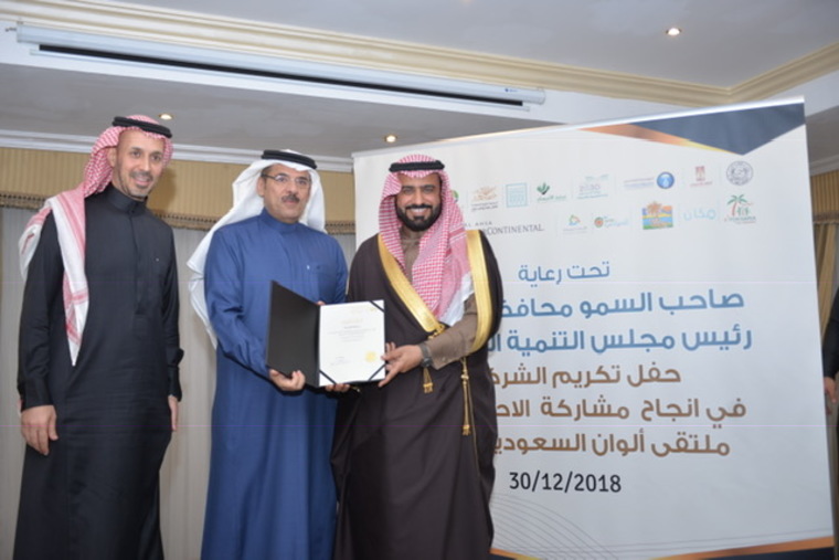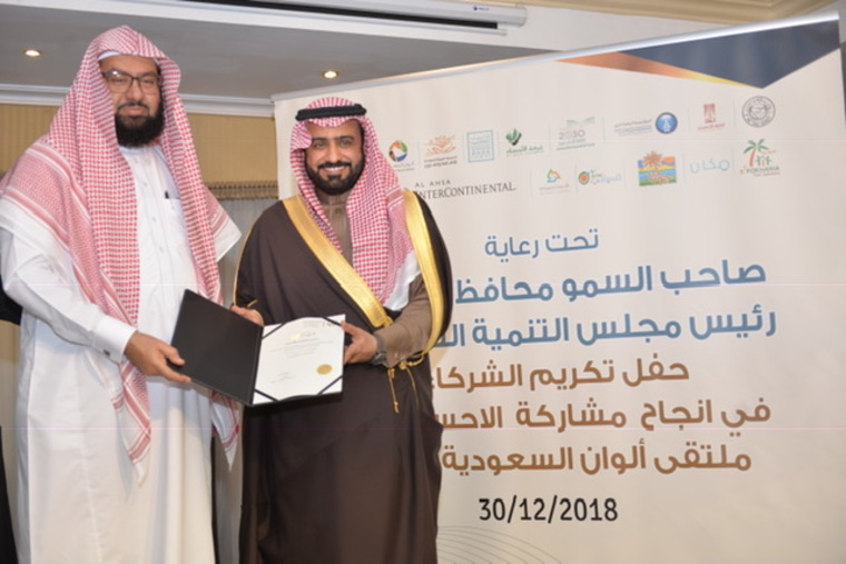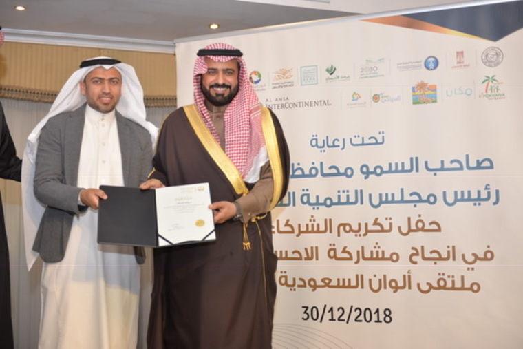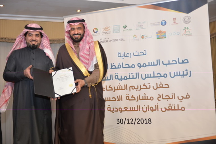 كُرِم شركاء النجاح في ملتقى ألوان السعودية 2018 تحت مظلة مجلس التنمية السياحة بالأحساء ، وذلك بقاعة الاندلس بأحد الفنادق وذلك برعاية محافظ الأحساء الأمير بدر بن جلوي ، وبحضور وكيل المحافظة معاذ الجعفري يوم الأربعاء.
