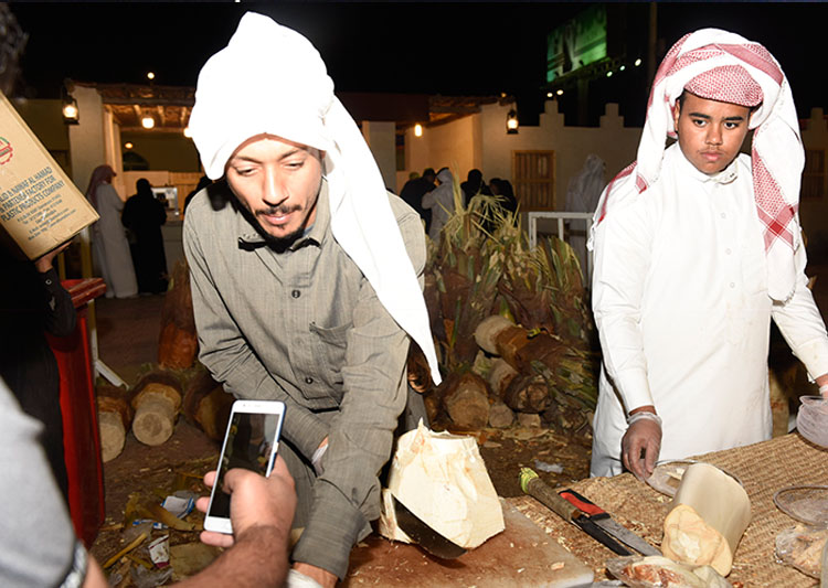 وذكر الشاب العريفي في حديثه الخاص مع «جهينة الإخبارية» خلال زيارتها للمهرجان، أنه يعمل على ”خرَف النخلَ“ منذ مايقارب 25 سنة، والتي تعني قطع عذوق التمر أو الجني، وكذلك استخراج ”الطلاّع“ من النخلة أو ”الجذب“ الذي يُسمى بـ «قلب النخلة».