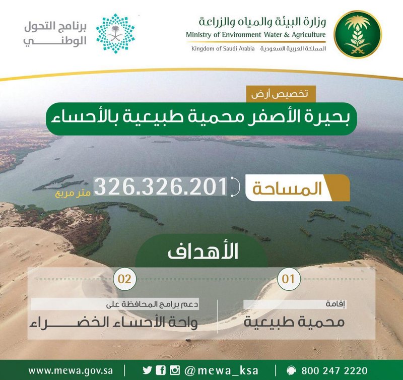وأوضح وكيل الوزارة للأراضي والمساحة المهندس صالح بن علي اللحيدان؛ أن الوزارة خصّصت أرض بحيرة الأصفر بمساحة قدرها 326,326,201 مليون متر مربع لإقامة محمية طبيعية بمحافظة الأحساء لمصلحة الوزارة، مشيراً إلى أنها ستساهم في دعم برامج المحافظة على واحة الأحساء الخضراء المعتمدة لدى ”اليونيسكو“.