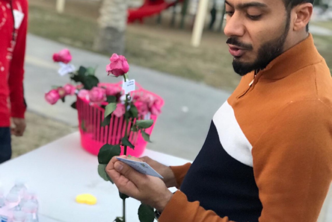 وقال قائد الفريق مسلم ال موسى تضمنت الفعالية توزيع الورد وكتابة كلمات عن المحبة. مشيرا الى مشاركة 5 متطوعين في المبادرة قاموا بتوزيع 100 وردة.