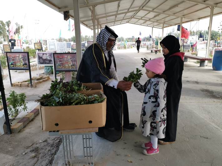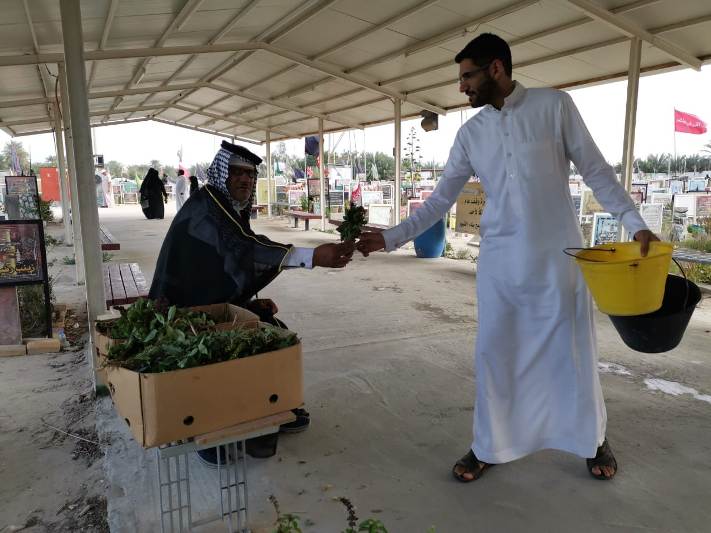 بالصور.. الكربلائي يهدي ”الريحان“ لزوار مقبرة تاروت