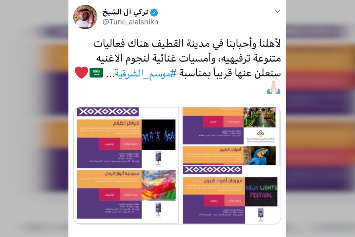 وقال رئيس هيئة الترفيه المستشار تركي آل الشيخ ان البرامج المعلنة هي باكورة الأنشطة الترفيهية في القطيف.