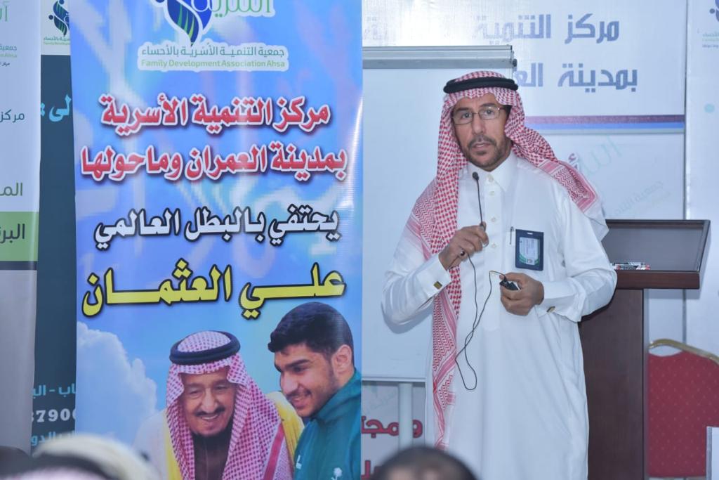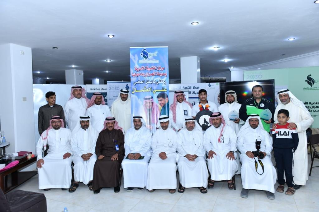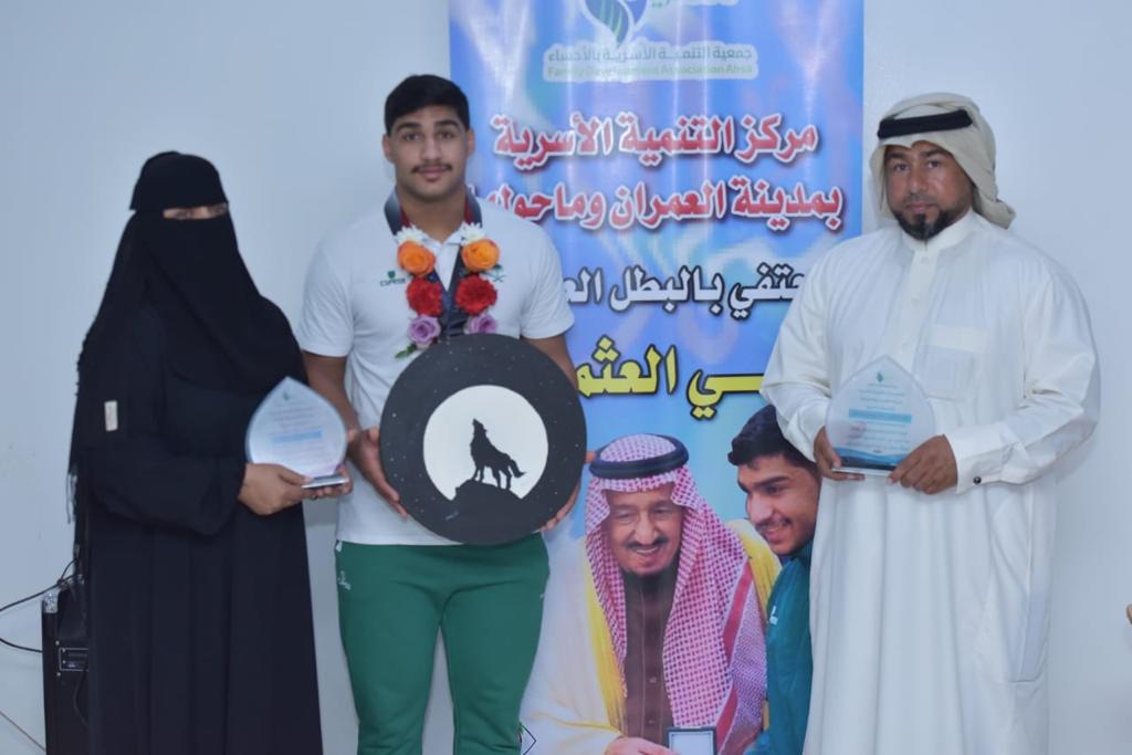 نظم مركز التنمية الأسرية بمدينة العمران وماحولها حفلاً للاحتفاء ببطل العالم للشباب في رفع الأثقال الأحسائي علي العثمان وأسرته ومدربه طاهر الشيبة، وذلك في مقر المركز مساء أمس الثلاثاء بحضور نخبة من الإعلاميين والنشطاء والمهتمين بالشأن الرياضي والأسري.