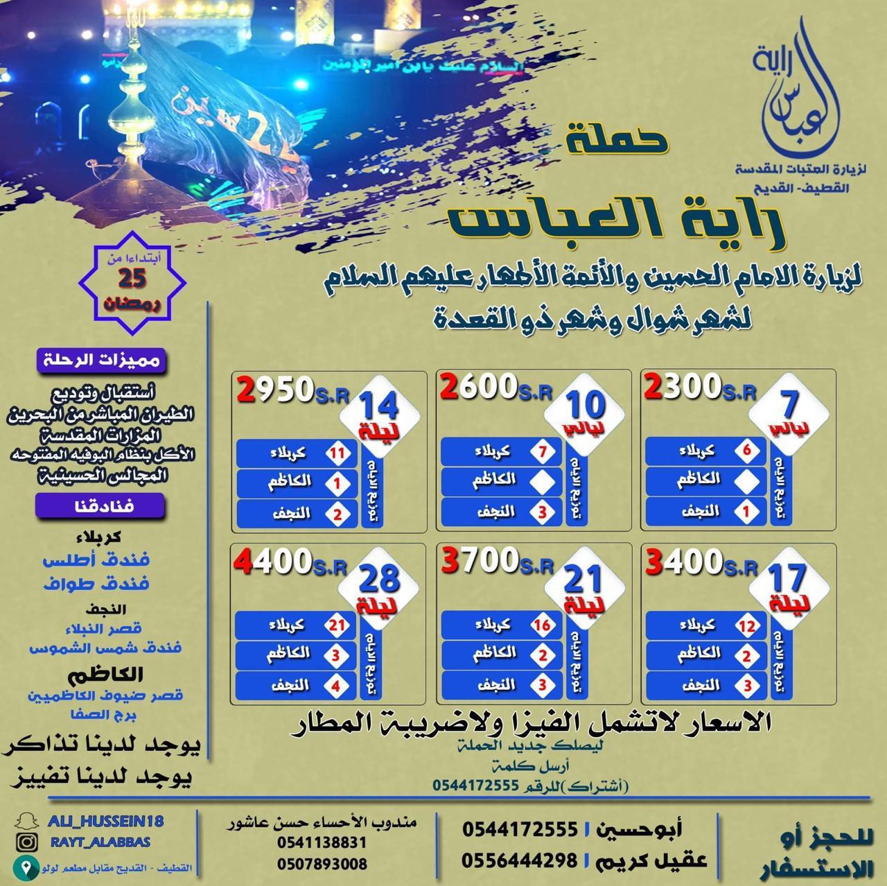 رحلات حملة «راية العباس» لزيارة الإمام الحسين والأئمة الأطهار عليهم السلام لشهر شوال وشهر ذو القعدة إبتداء من 25 رمضان