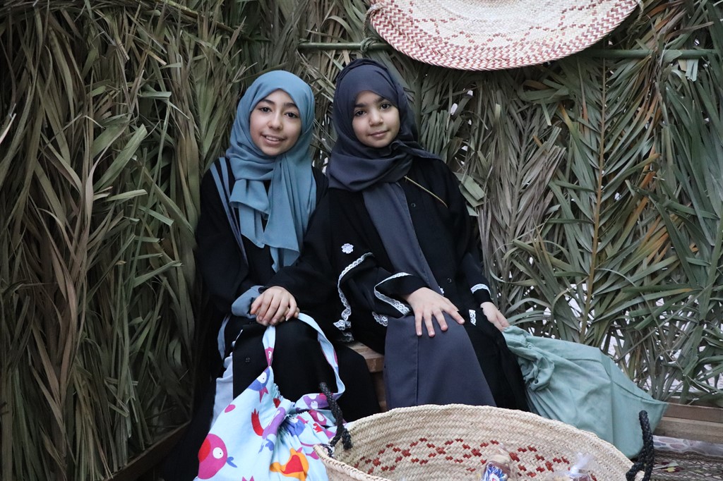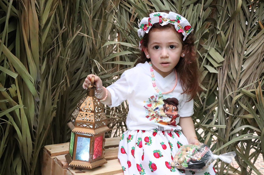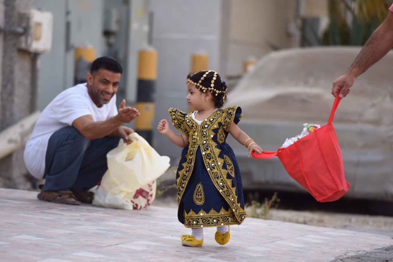 وارتدت الفتيات الصغيرات ما يعرف ب «المخنق او الملفع» وهو حجاب مطرز بالزري الذهبي والفضي والجلابيات المحاكة بالزخارف والنقوش الملونة وهن يحملن اكياسهن التي امتلأت بمختلف التوزيعات.