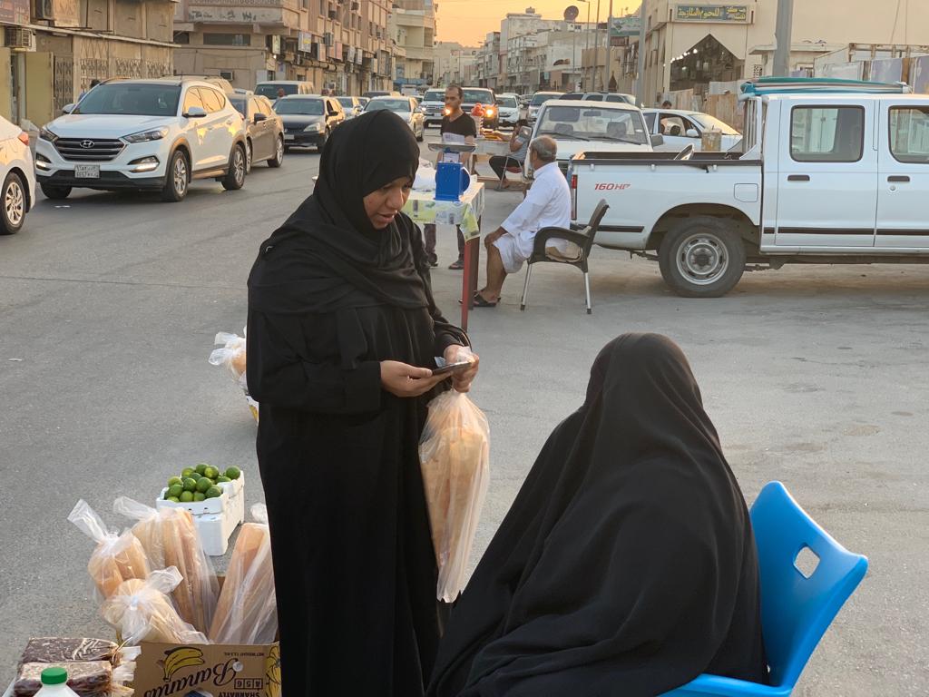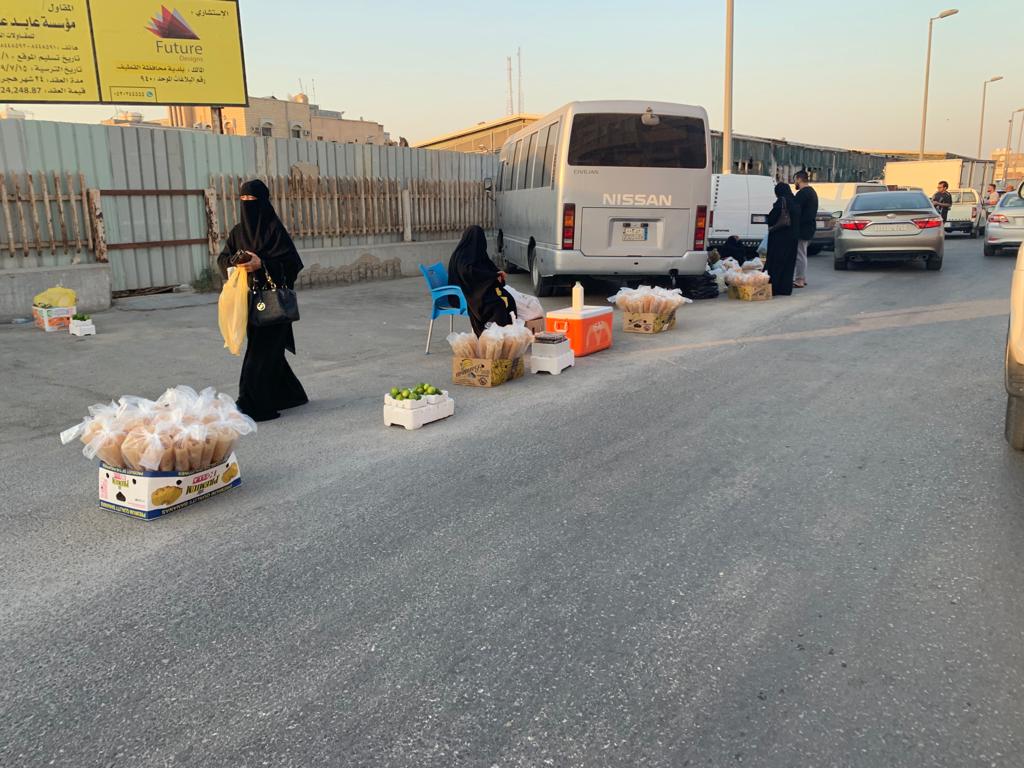 السيدتان اللتان تتشحان السواد وتفصل بينهما حافلة متوقفة على جانب الطريق، أتخذت كل منهما مكاناً لعرض بضاعتها تنتظران المارين سيراً على الأقدام أو بالسيارة لتصريف بضاعتها قبل الأخرى.