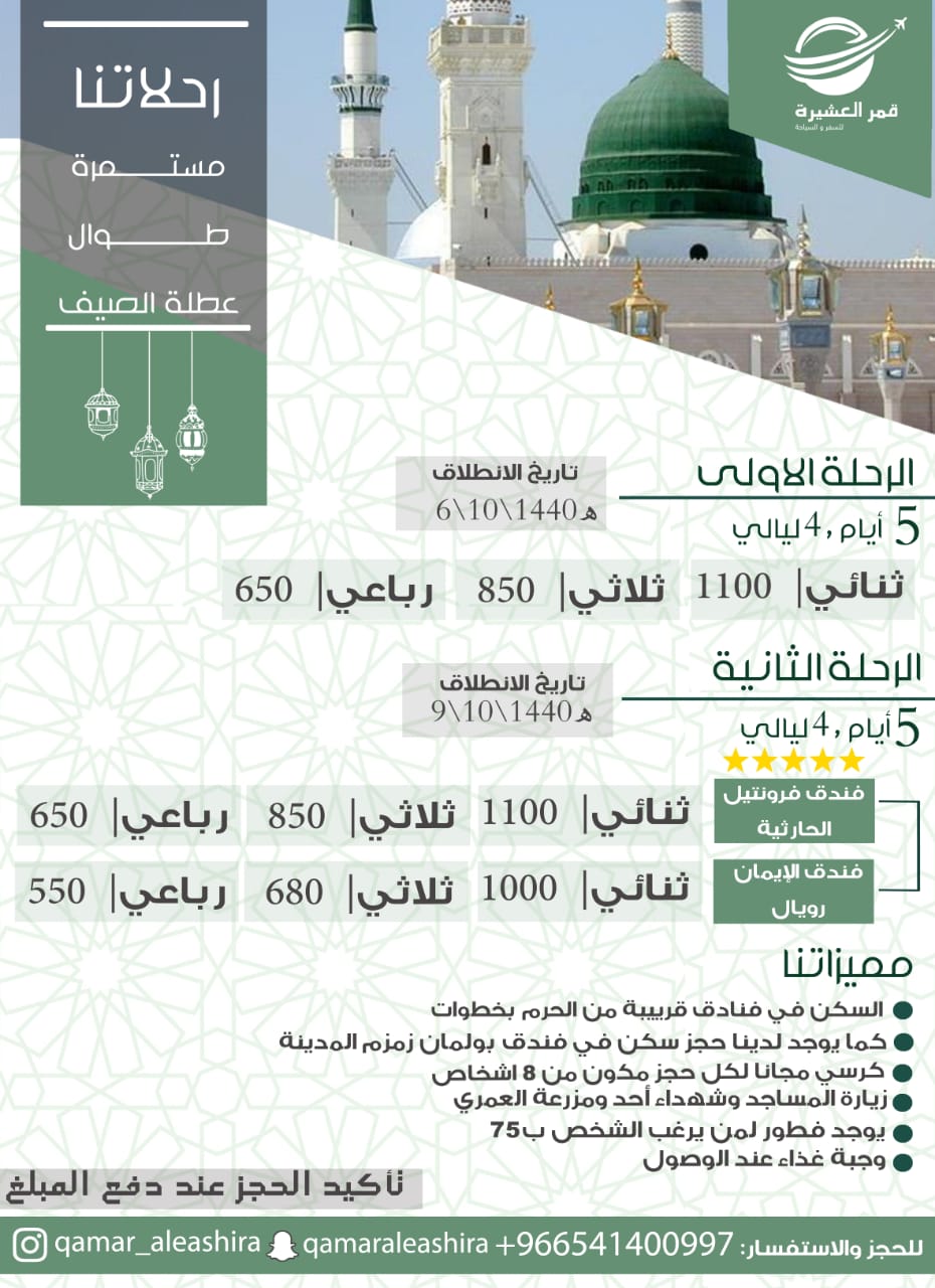 تاريخ الذهاب 9 / 10 / 1440 هجري خمسة ايام «4 ليالي»