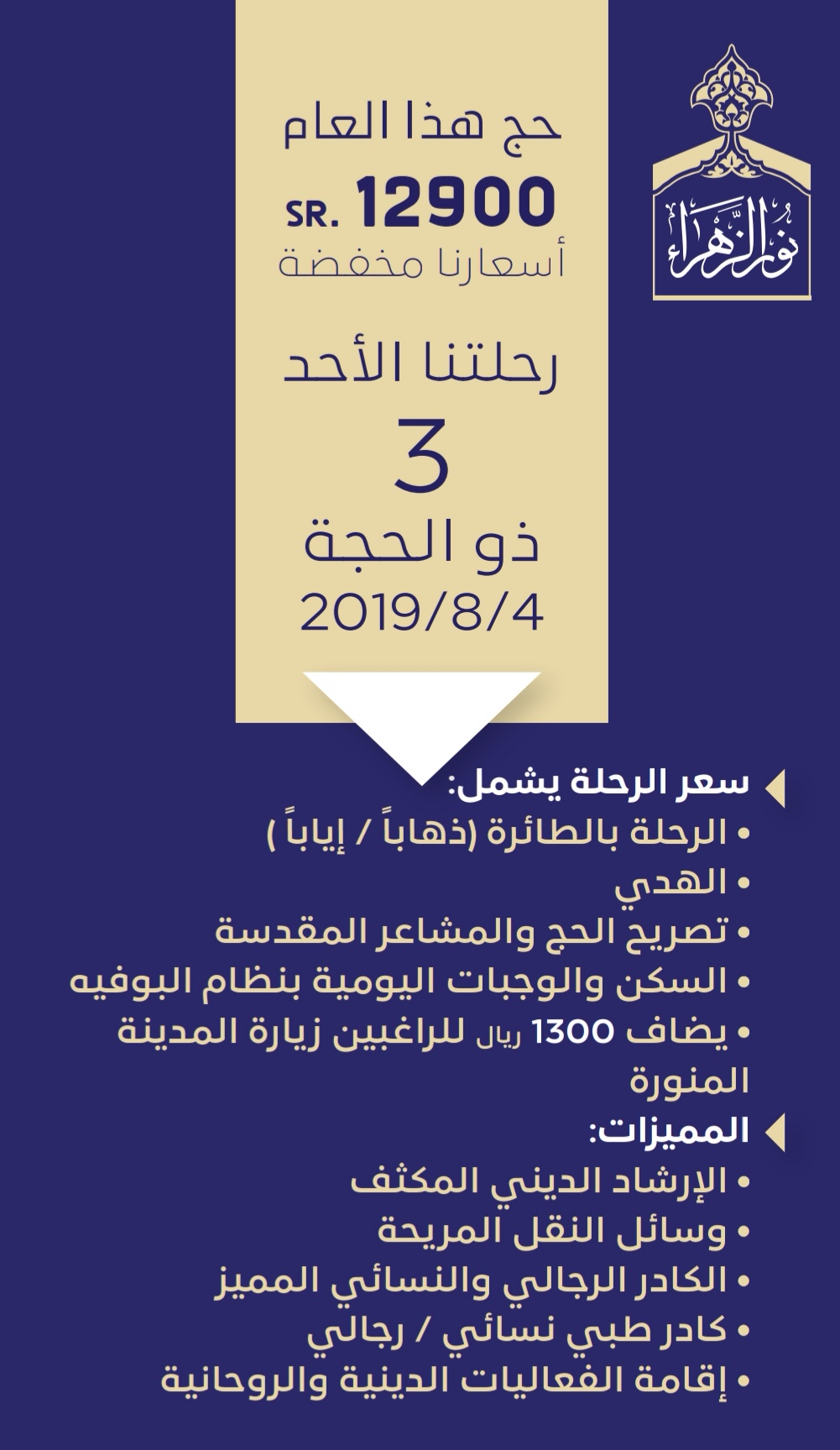يسعدنا ويشرفنا اختياركم لحملة نور الزهراء لأداء فريضتكم العبادية، ونضع بين أيديكم برنامج الحج لعام 1440..