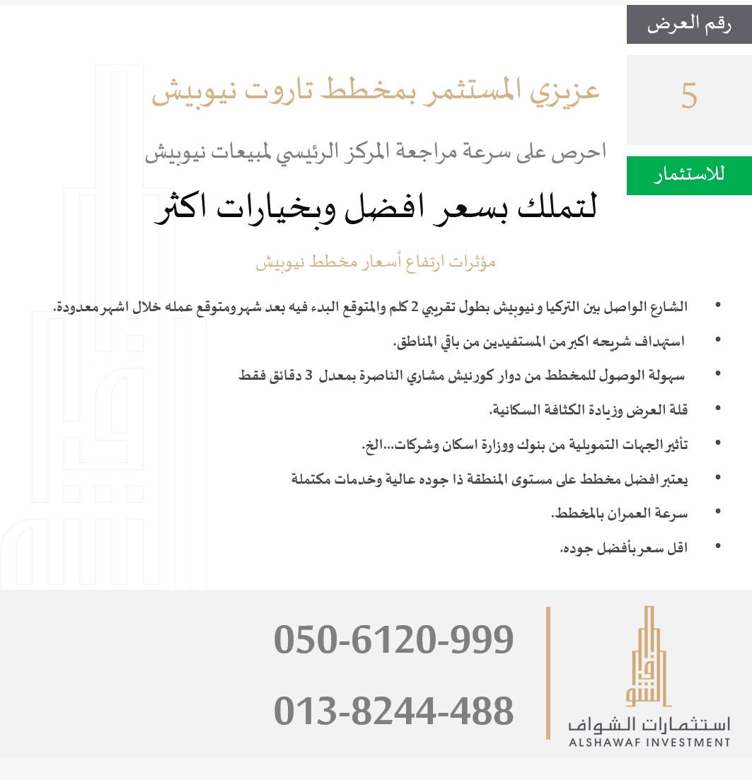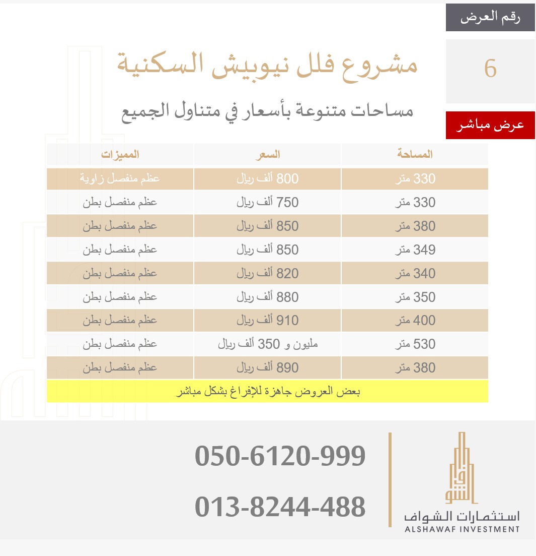هل تحلم بسعر أفضل وخيارات أكثر؟... راجع استثمارات الشواف ”المركز الرئيسي لمبيعات نيوبيش“