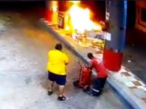 وبادر الشاب الذي كان يرتدي ”تيشيرت“ أصفر إلى سحب طفايات الحريق من بين المضخات، واستمر في توجيه خراطيمها حتى أخمدها بهدوء وحكمة.