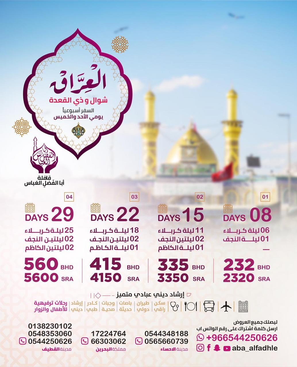 عروض خيالية في ذو القعدة وعرفة إلى العراق كل أسبوع مع قافلة أبا الفضل العباس