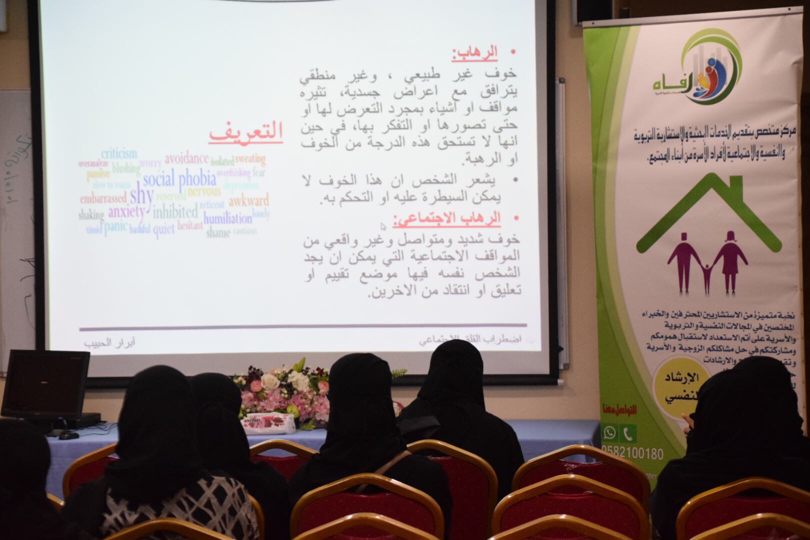 وبينت في محاضرتها بعنوان ”الرهاب الإجتماعي“ أمس بمركز رفاه للدرسات والتنمية الأسرية بسيهات، على أن القلق هو الأكثر شيوعا في الإضطرابات النفسية 30 - 40%، ويحتل الرهاب الإجتماعي مانسبته 25% منه.