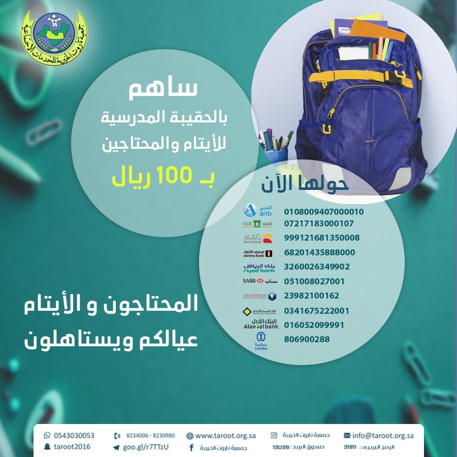 أطلقت خيرية تاروت برنامج الحقيبة المدرسية والذي يعد له سنوياً من قبل لجنتي كافل اليتيم والتكافل الاجتماعي ويشمل جميع المراحل الدراسية.