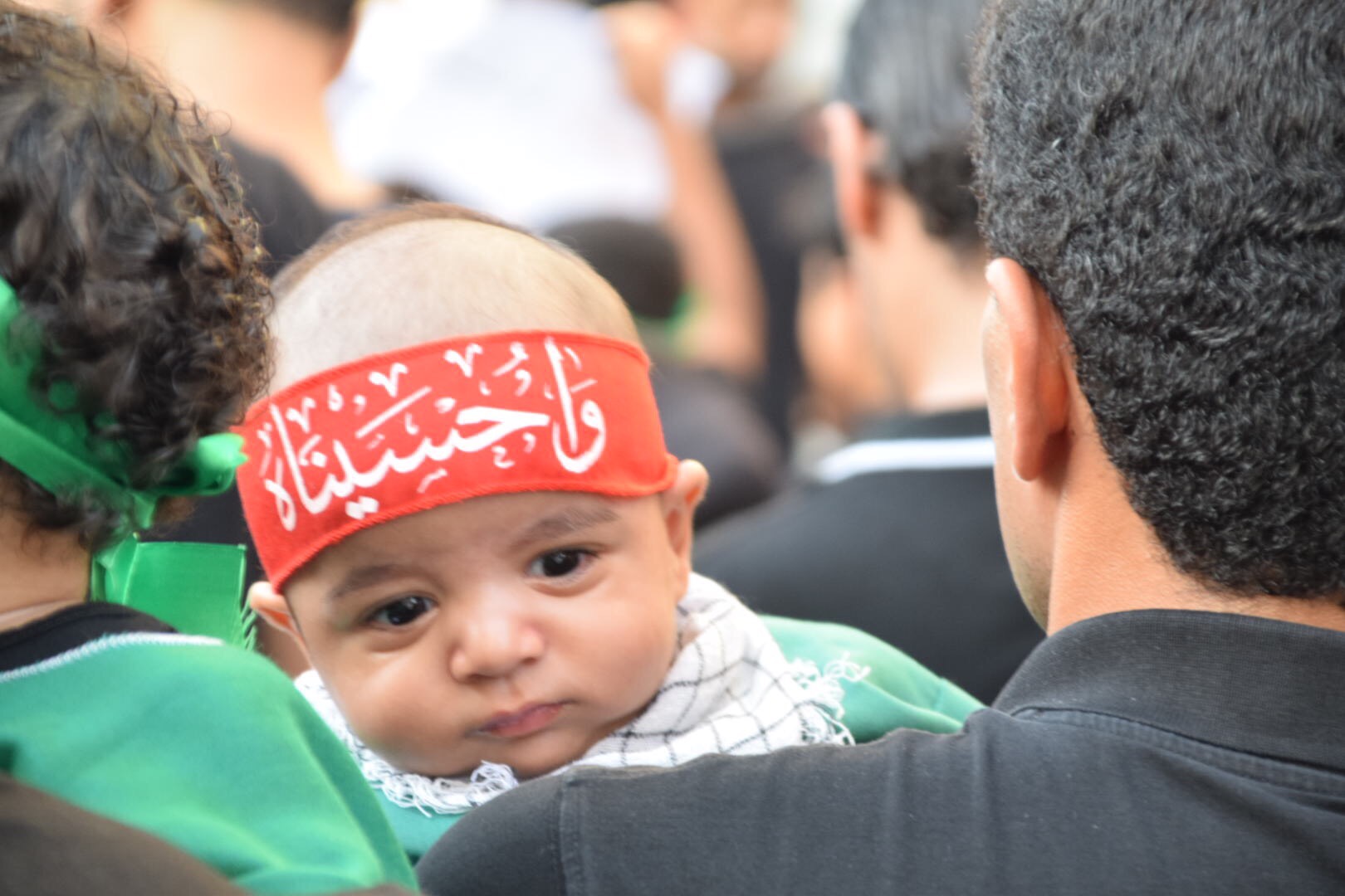 واتشح الأطفال في هذه المسيرة باللونين الأخضر والأحمر، وأخذوا يلوحون بباقات الريحان والأعلام وهم يهتفون بالتلبية للحسين ويجددون عهدهم مع الطفل الرضيع.