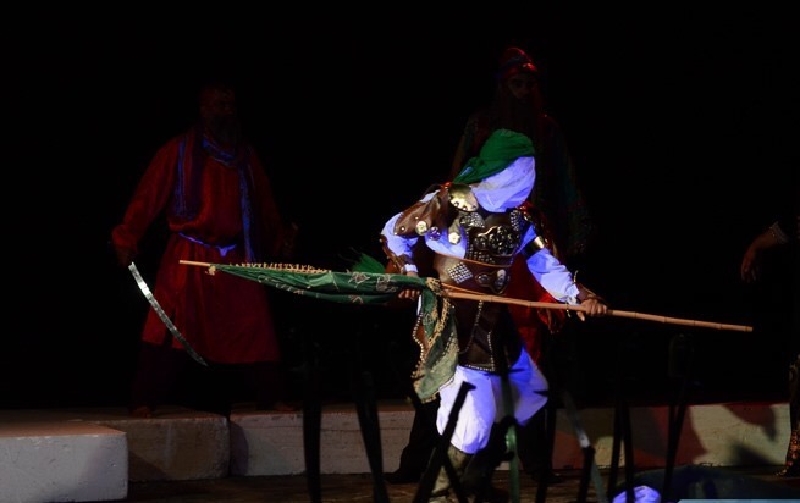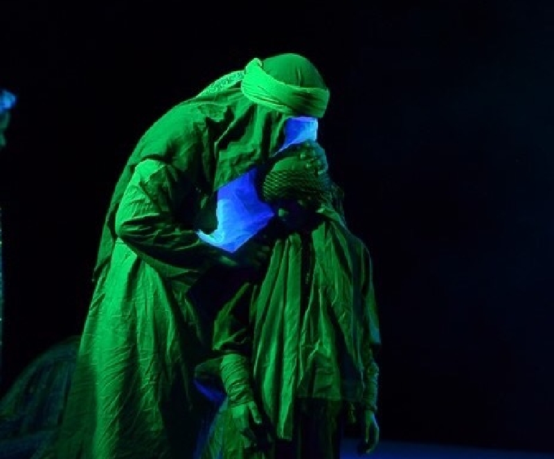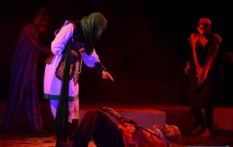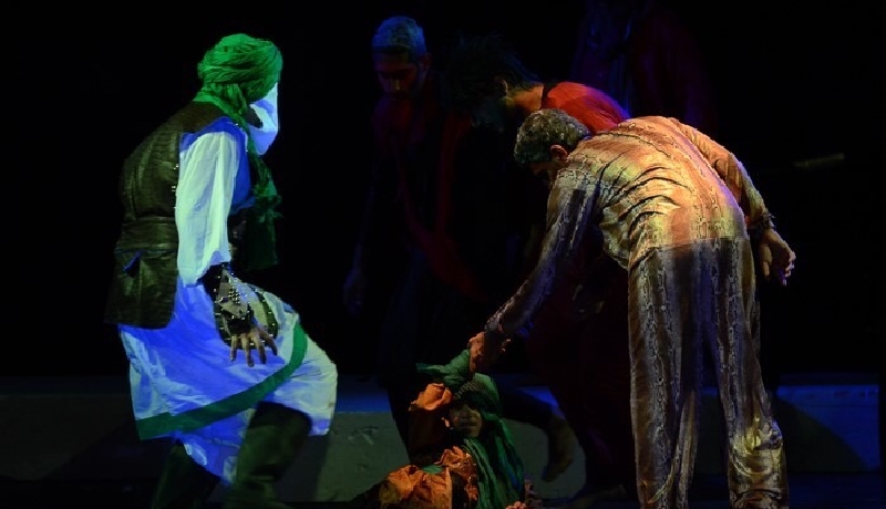 وأضاف أنه لم يوظف السيوف في هذا العرض المسرحي عدا سيف شمر بن ذي الجوشن، مستخدما مفارقات وعكس الادوار الحقيقية حيث جعل الإمام الحسين قاتلا للشمر لا العكس.