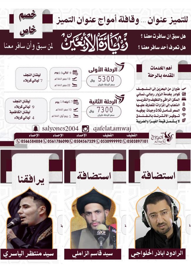 قافلة أمواج تعلن عن برنامجها لزيارة الأربعين لعام 1441 بسعر 4850 ريال