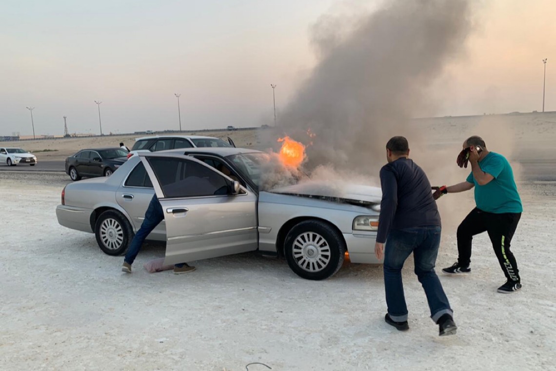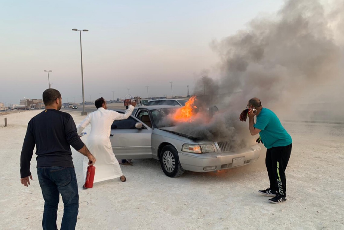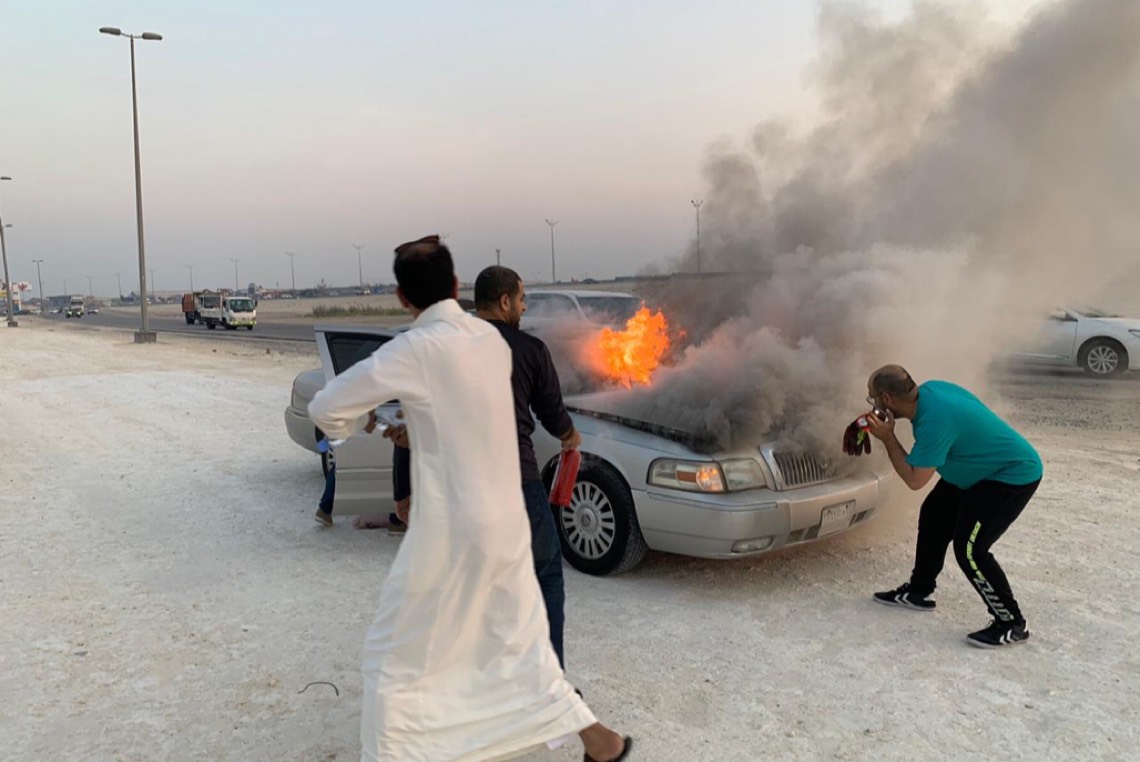 وكان الشاب يقود سيارته وفوجئ بنشوب حريق بمحركها، فقام على الفور بإيقافها والنزول ومحاولة السيطرة على النيران بمساعدة عدد من المواطنين، قبل وصول رجال الدفاع المدني.