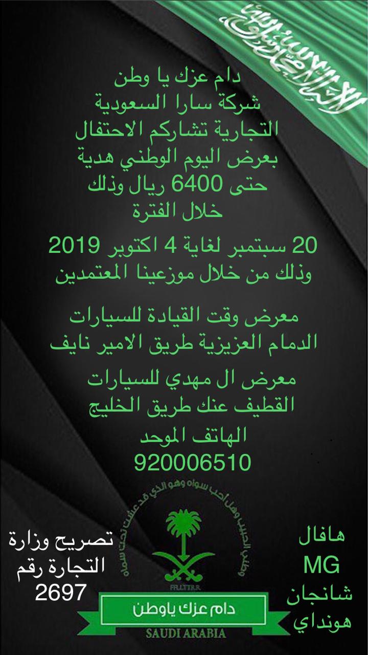 شركة سارا السعودية التجارية تشاركم فرحة اليوم الوطني وذلك عند شراء اَي سيارة تحصل على هدية قسيمة تجارية لغاية 6400 ريال من خلال موزعينا المعتمدين