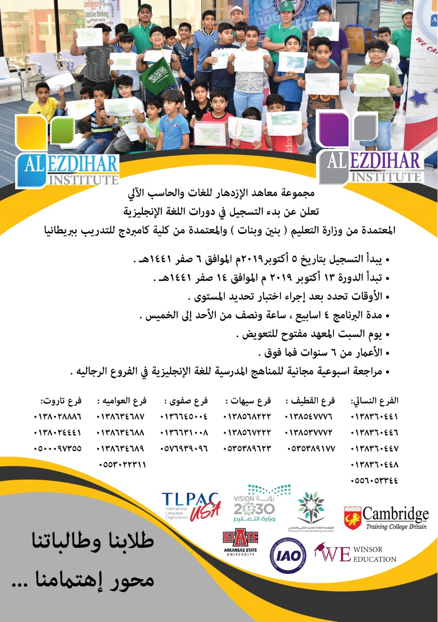 مجموعة معاهد الإزدهار للغات و الحاسب الآلي تعلن عن بدء التسجيل في دورات اللغة الإنجليزية