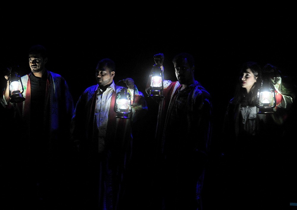 فكان الممثلون الأربعة هم الحكواتية وهم أبطال القصة، وهم الشخصيات التي يستحضرها أبطال القصة عندما يستعرضون قصصهم.