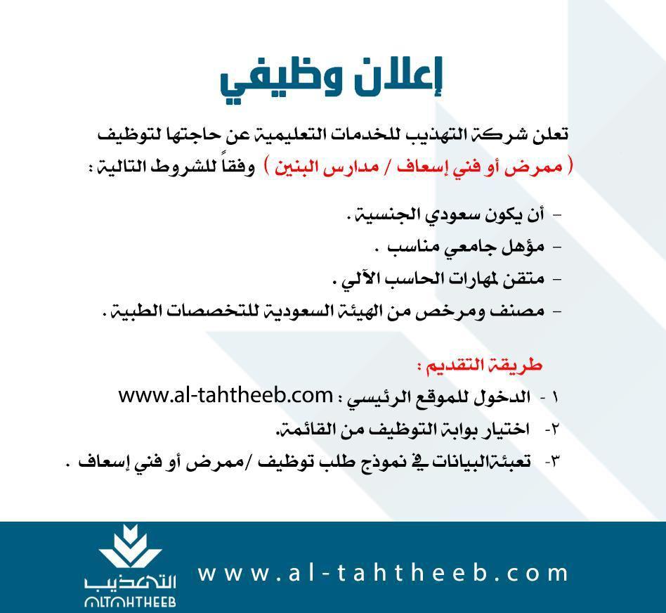 تعلن شركة التهذيب للخدمات التعليمية عن حاجتها لتوظيف