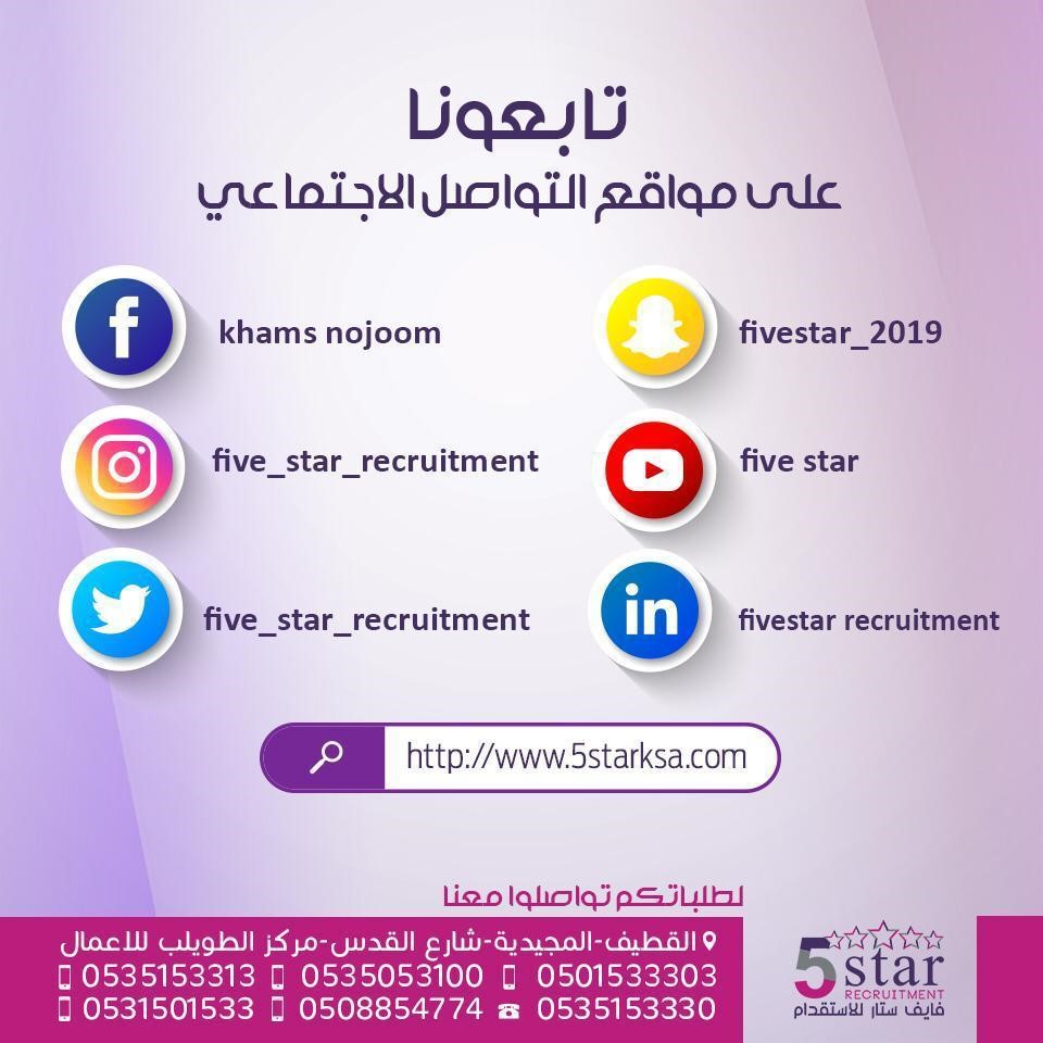 تابعوا مكتب ”فايف ستار للاستقدام“ على مواقع التواصل الإجتماعي