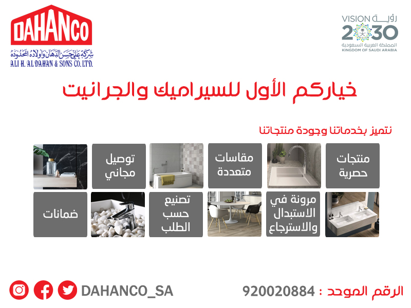 نتميز بخدماتنا وجودة منتجاتنا تشكيلة متميزة ومتنوعة من السيراميك والجرانيت والمواد الصحية تلبي جميع الأذواق وبأسعار منافسة..