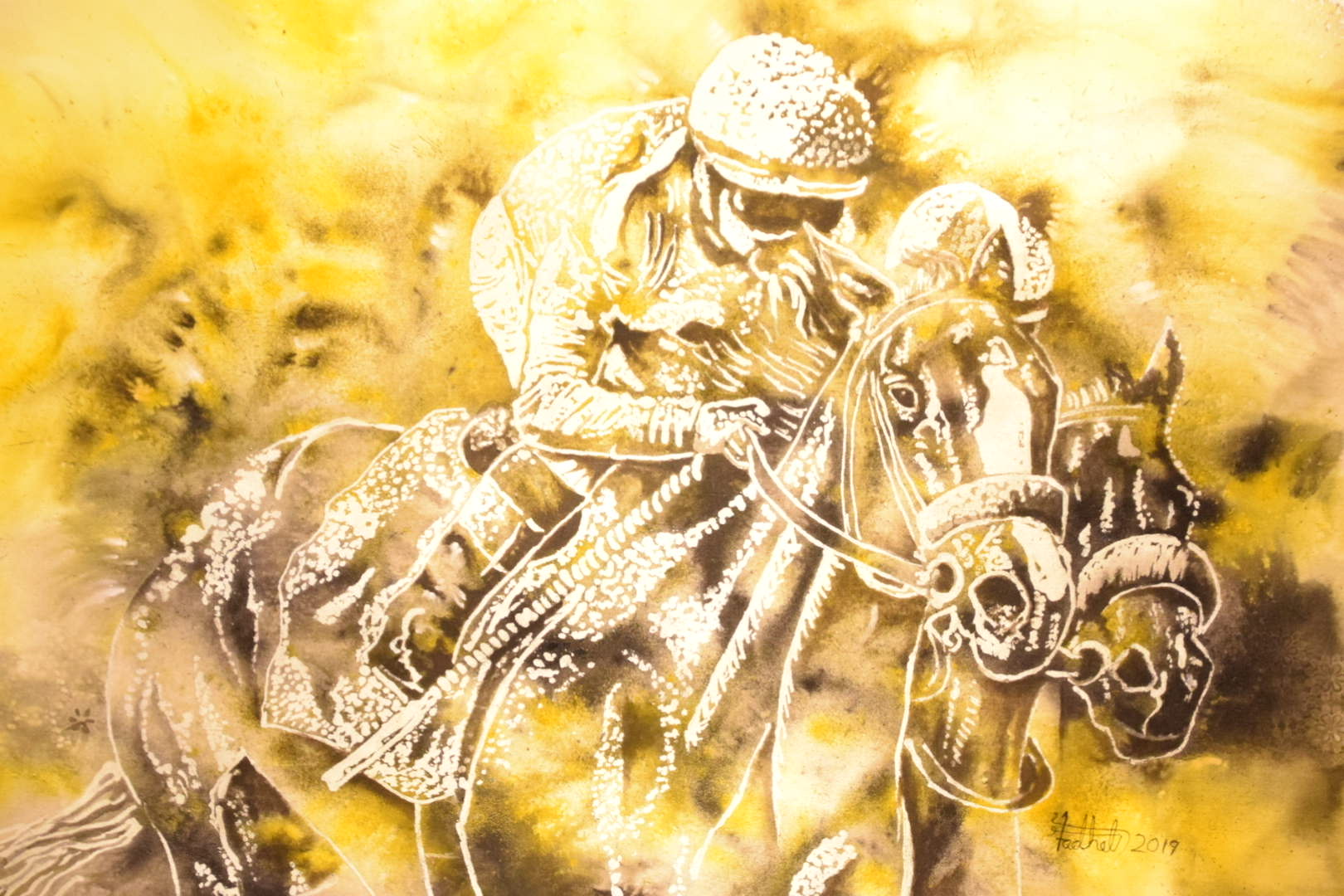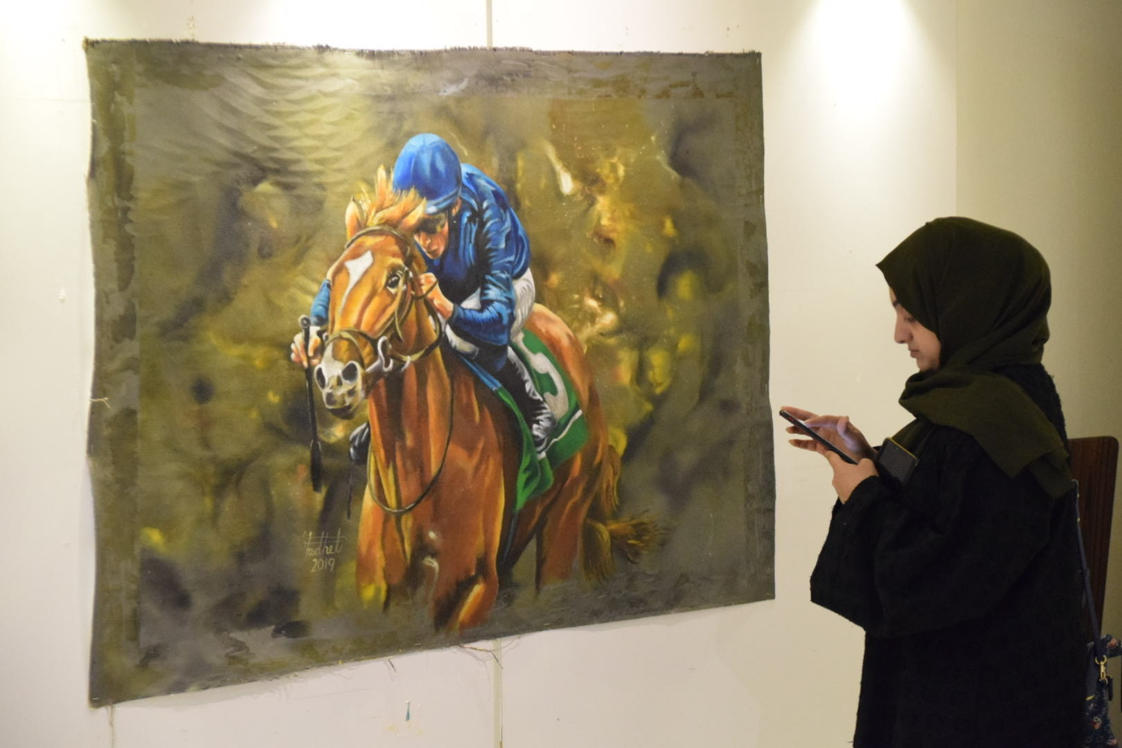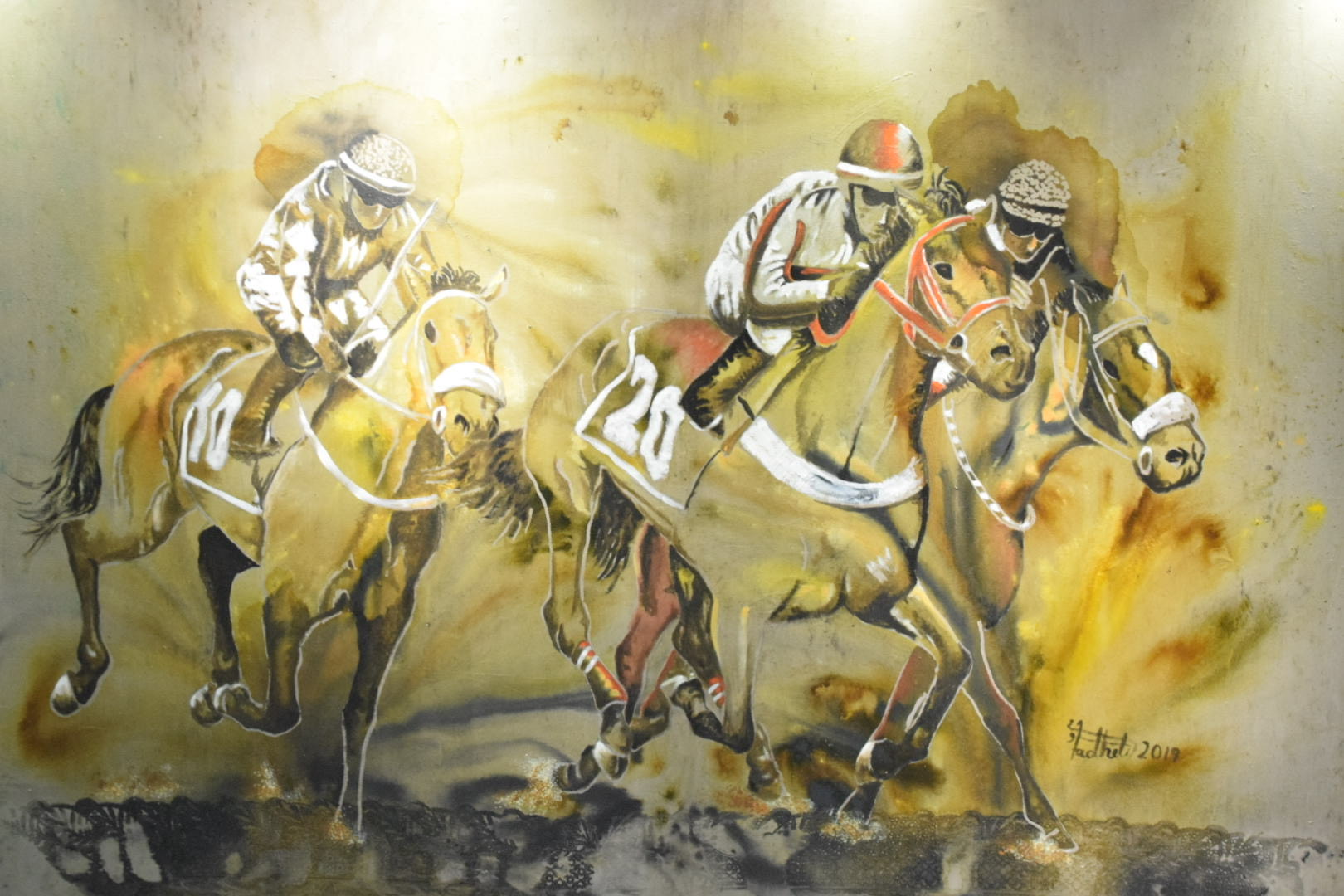واحتوى المعرض على 25 لوحة للفنان بوشومي من الحجم الكبير وموضوعها ”بين الخيل.. وخط النهاية“.