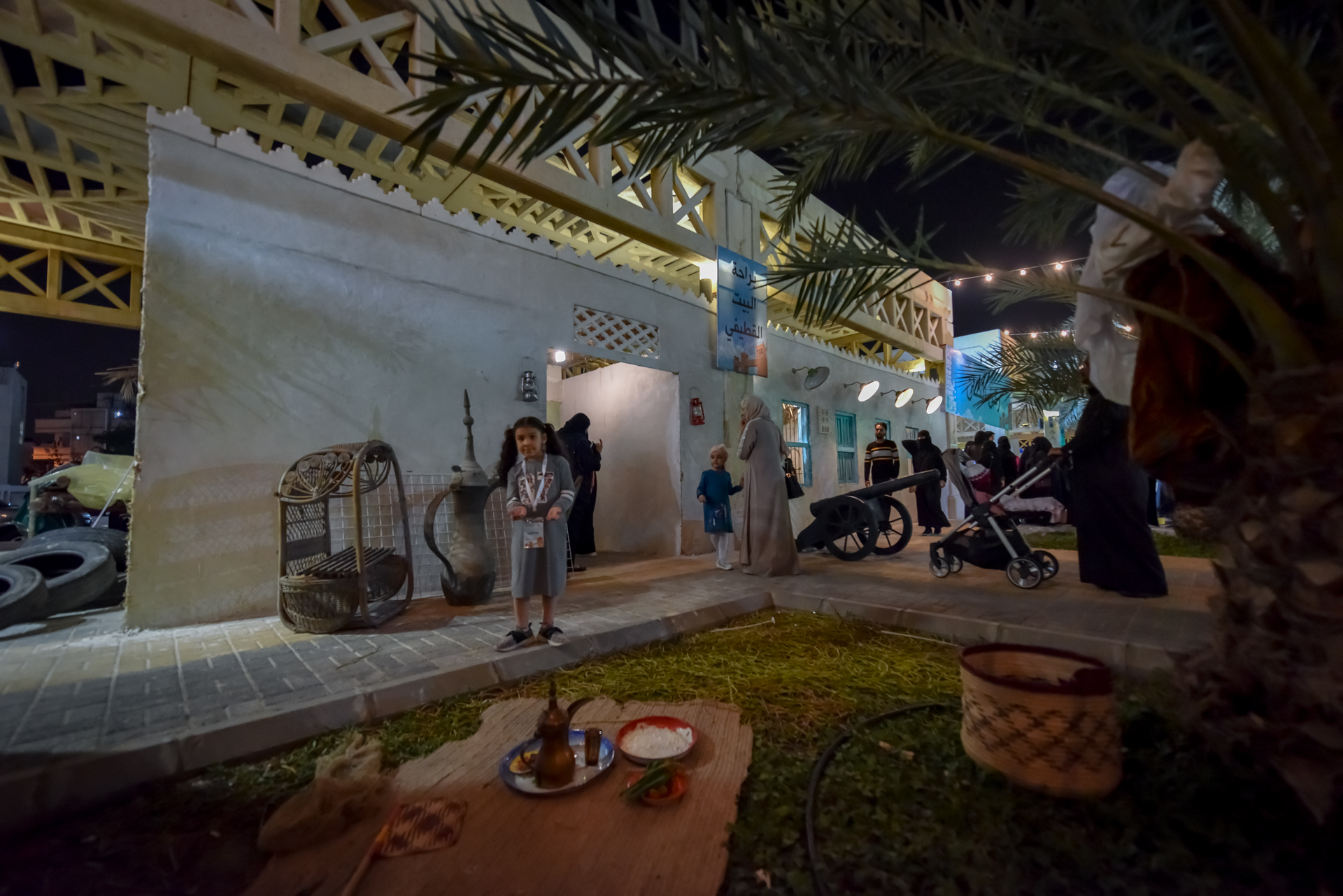 بين جدران البيت القطيفي ورائحة التراث الأصيل تجمهر زوار مهرجان البراحة الثاني حول الطفلة زين المشعل التي حملت اسم أصغر راوية لتراث القطيف.