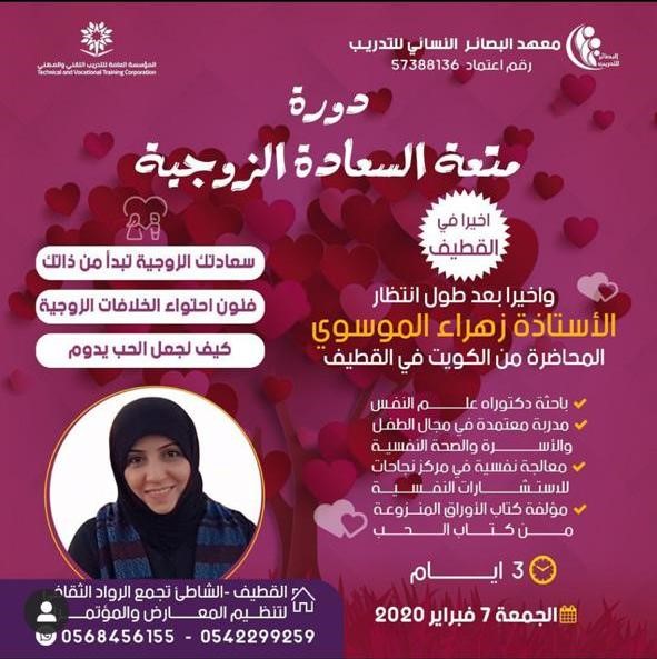 وأخيرا في القطيف.. ”متعة السعادة الزوجية“ تقدمها المدربة زهراء الموسوي