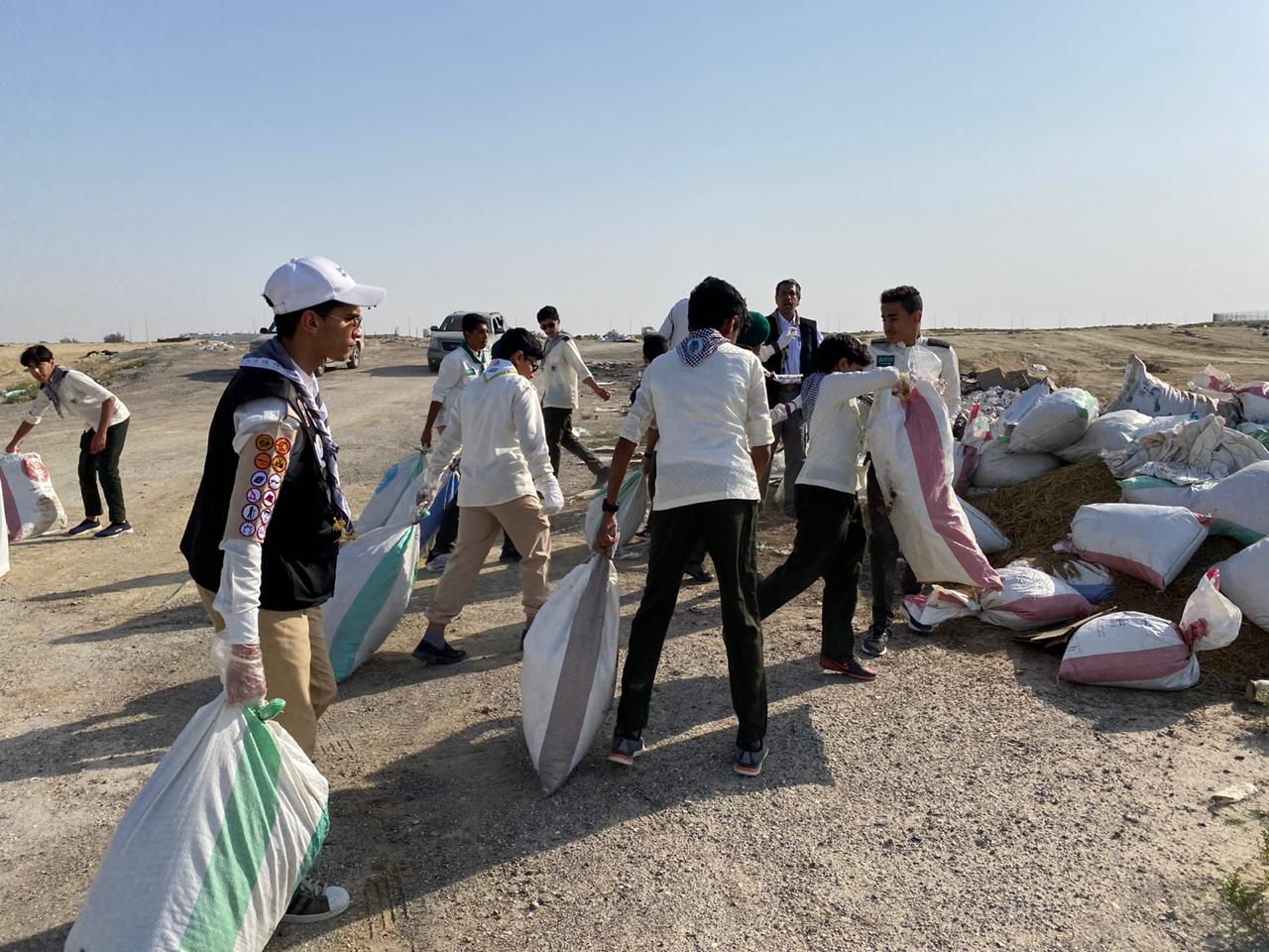 وقام الكشافة بجمع المخلفات البلاستيكية في بر المطار حيث تكثر المخلفات البلاستيكية.