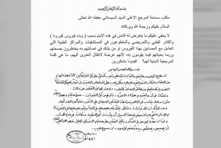 وقدّم السيستاني الشكر للكادر الطبي قائلا ”نقدم لهم جزيل الشكر وبالغ القدير على عملهم الإنساني الجليل وندعوا الله أن يحميهم ويحفظهم ويبعد عنهم كل سوء“.