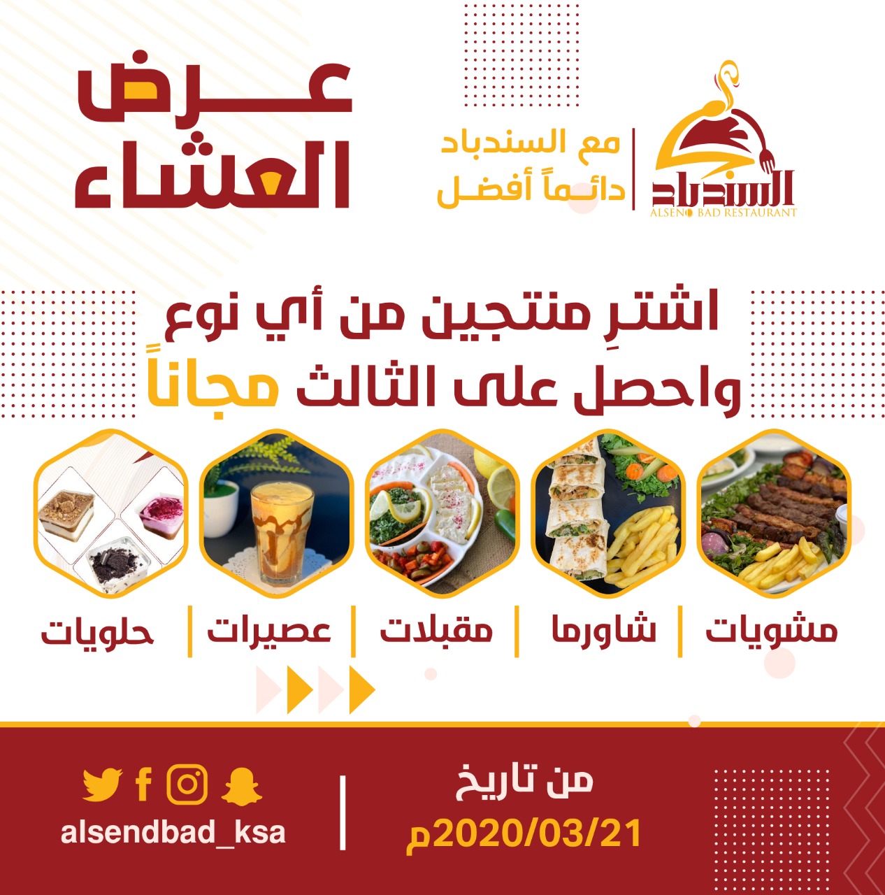اشتر منتجين من أي نوع ”مشويات - شاورما - مقبلات - عصيرات - حلويات“ واحصل على الثالث مجانا.