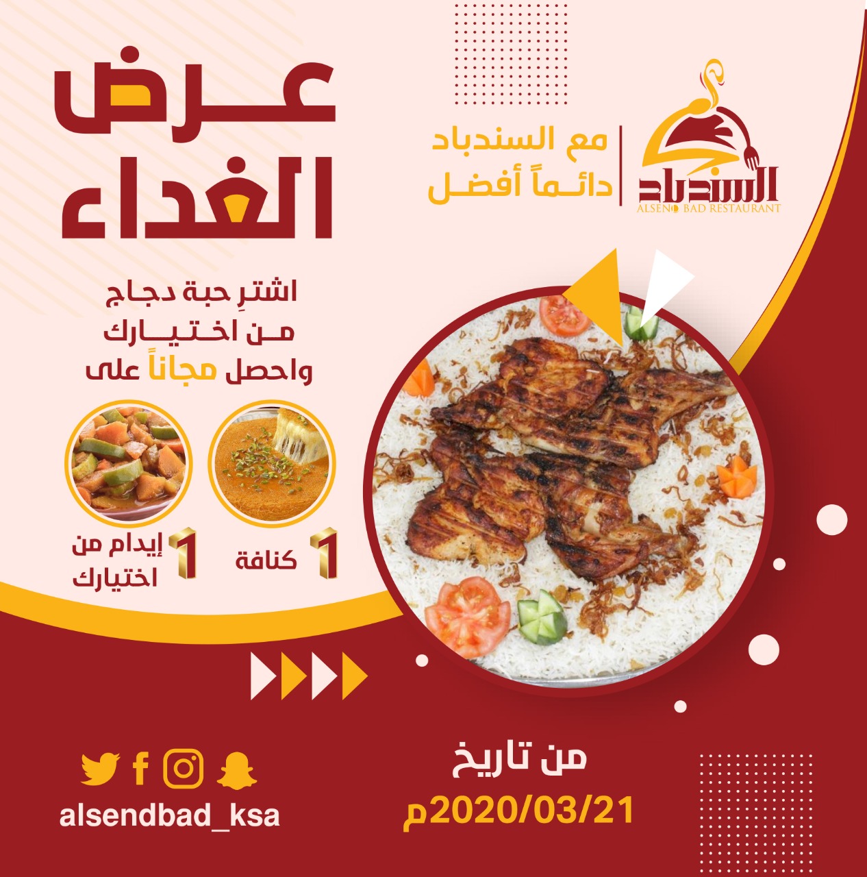 لا تفوتك.. عروض ”السندباد“ لوجبتي الغداء والعشاء والتوصيل مجاني