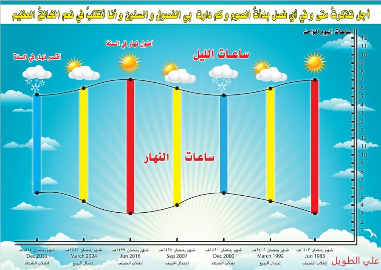 ومعروفاً عدم تزامن السنة الشمسية بفصولها الأربعة مع الأشهر القمرية، وبالشكل البياني المصور أبين تعاقب كافة الفصول الأربعة علينا في أشهر رمضان المبارك، حيث اتخذتُ من منتصف شهر رمضان من كل عام نقطة مرجعية سجلت ما يصادفها أو قرب منها من الفصول الأربعة فسبحان الله.