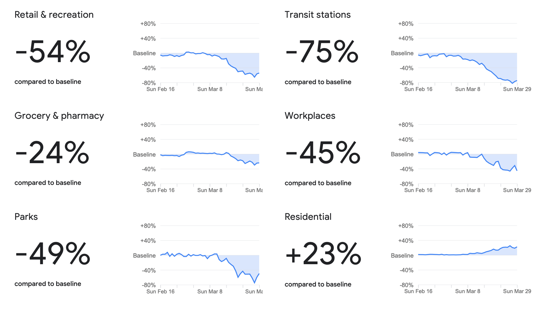 وأوضحت الأرقام انخفاض تواجد الأفراد في المطاعم والمقاهي بنسبة 54٪ وفي الحدائق والميادين بنسبة 49٪ بالإضافة إلى انخفاض تواجد الأفراد في أماكن العمل بنسبة 45٪، وانخفاض تواجد الأفراد بنسبة 24٪ في محلات التموينات الغذائية والصيدليات.