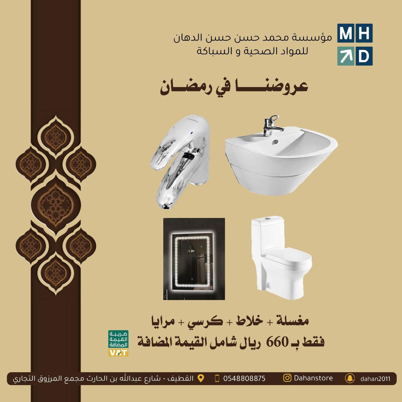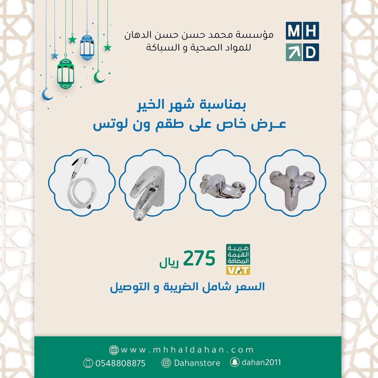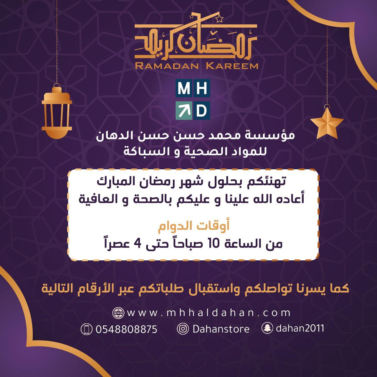 يسر مؤسسة محمد حسن حسن الدهان التجارية ان تهنئكم بشهر رمضان المبارك وان نعلن لعملاءنا الكرام عن استمرار خدماتنا وعروضنا على الأدوات الصحية