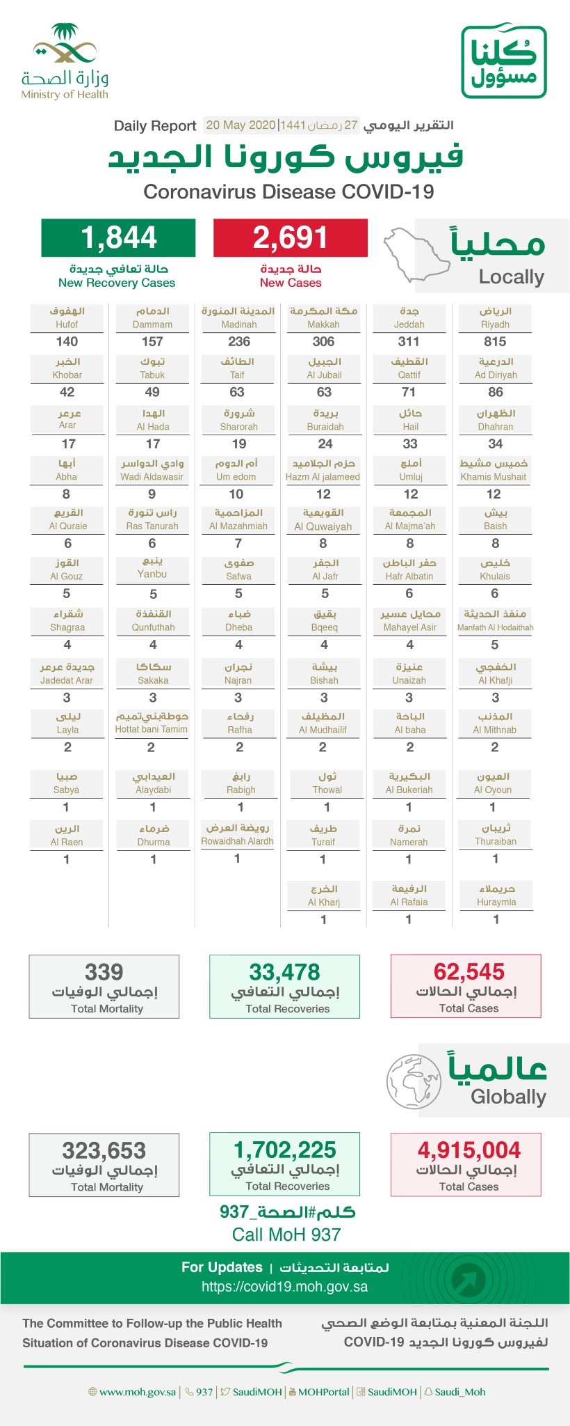 أعلنت وزارة الصحة، اليوم الأربعاء، ارتفاع إجمالي الإصابات بفيروس "كورونا" المستجد (كوفيد - 19) في المملكة إلى 62545 حالة مؤكدة، بزيادة 2691 إصابات عن المسجلة أمس. منها 71 في القطيف و5 بصفوى.