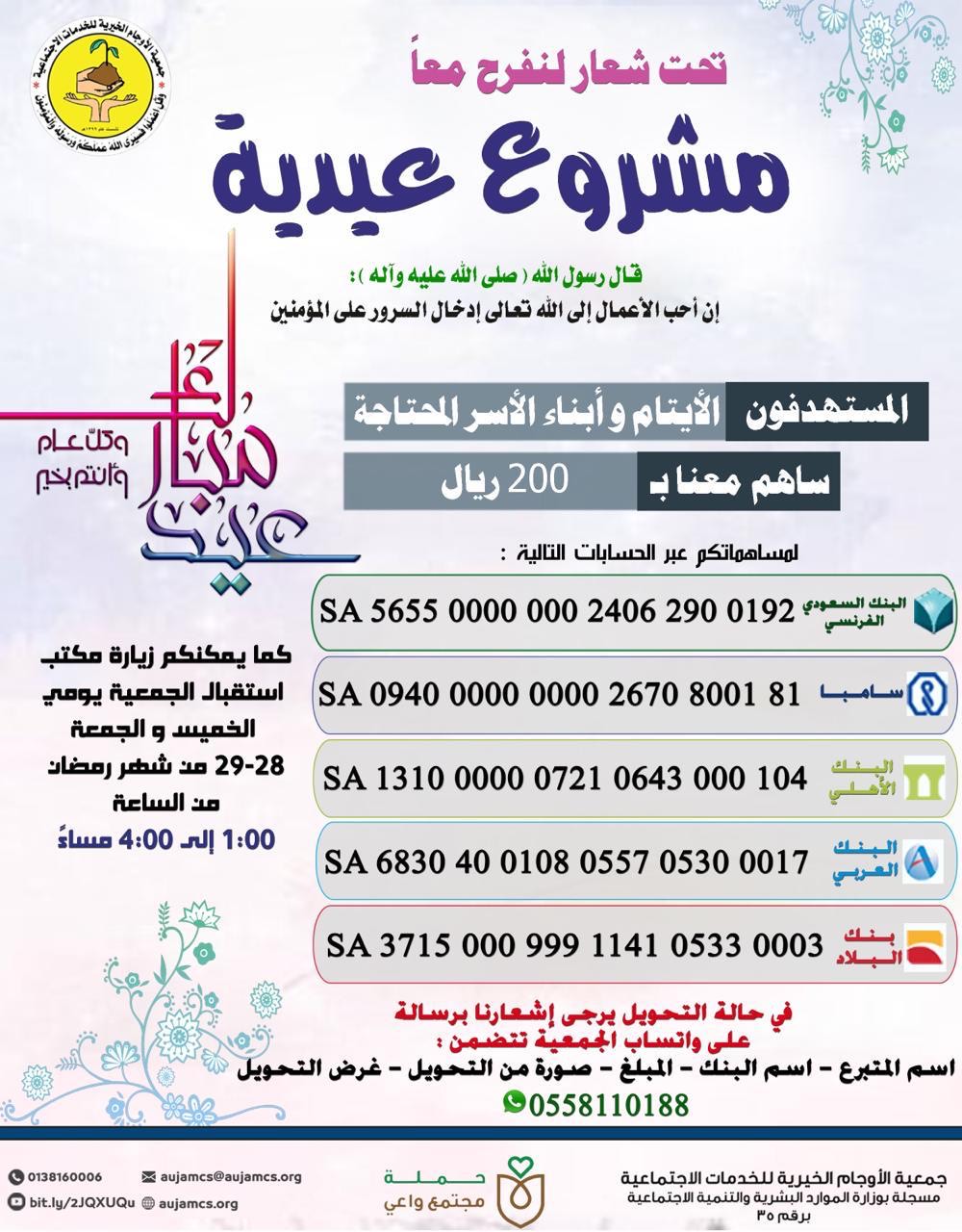 وأشارت إدارة الجمعية بأن قيمة السهم هو 200 ريال، منوهة بأنه وللمساهمة التحويل عبر حسابات الجمعية مع إرسال رسالة عبر واتساب جوال الجمعية 0558110188 تتضمن اسم المتبرع - اسم البنك - المبلغ المتبرع به - غرض التحويل وصورة من سند التحويل.
