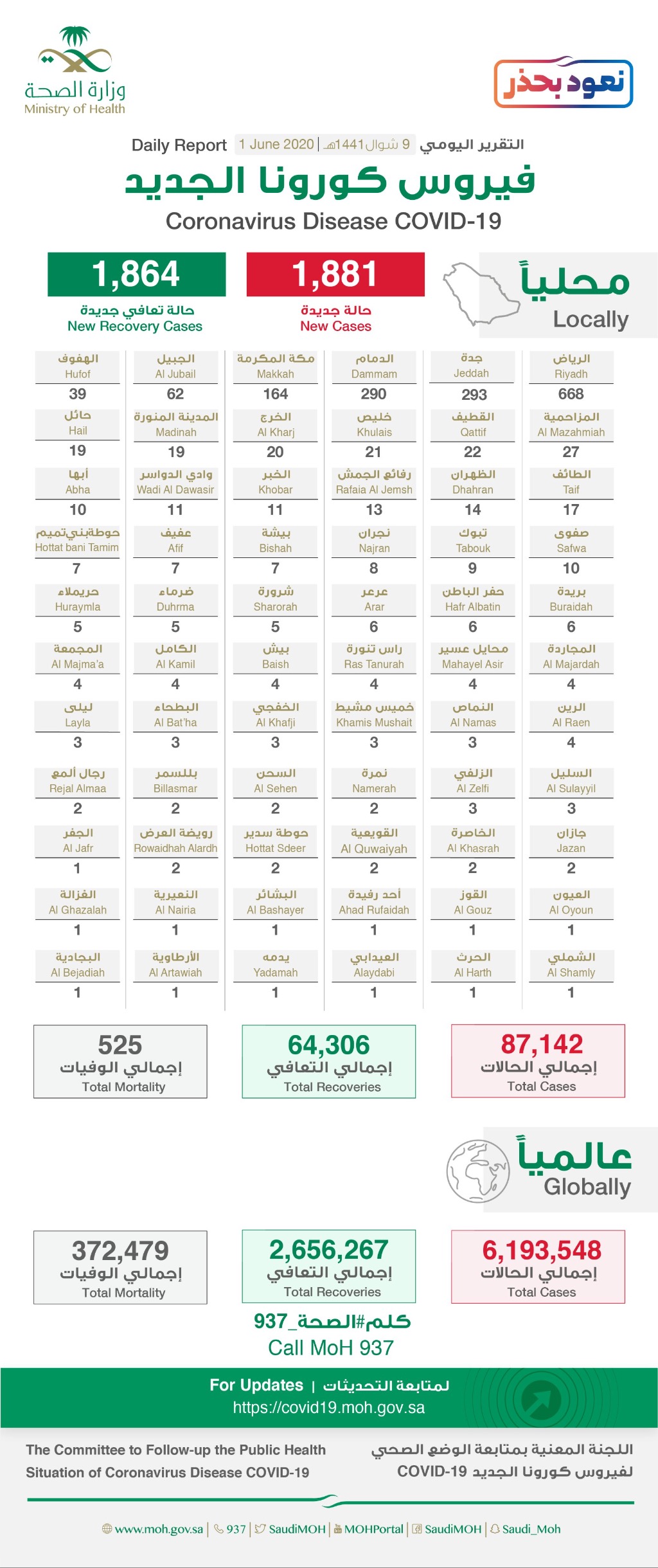 أعلنت وزارة الصحة، اليوم الاثنين، تسجيل 1881 إصابة جديدة بفيروس ”كورونا“ المستجد ”كوفيد - 19“ في المملكة. منها 22 في القطيف و10 بصفوى.
