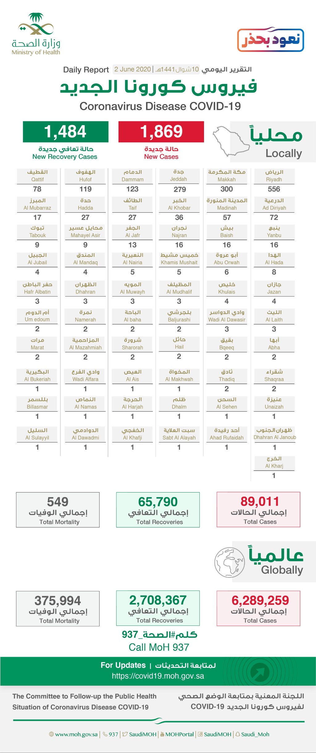 وتم تسجيل 1484 حالة تعافٍ جديدة، لترتفع الحالات الإجمالية للتعافي إلى 65790 حالة «74 % من إجمالي الإصابات المسجلة».