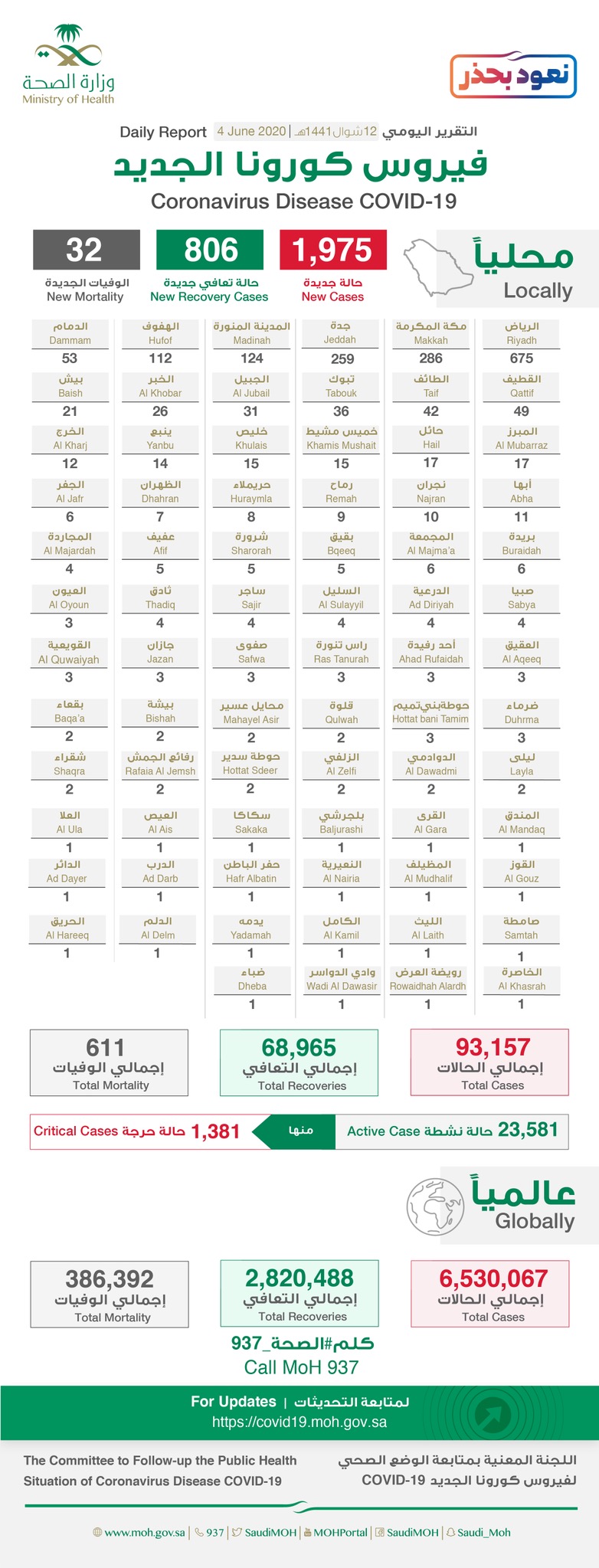 وتم تسجيل 806 حالة تعافٍ جديدة، منها 4 حالات بالقطيف لترتفع الحالات الإجمالية للتعافي إلى 68965 حالة (74 % من إجمالي الإصابات المسجلة).