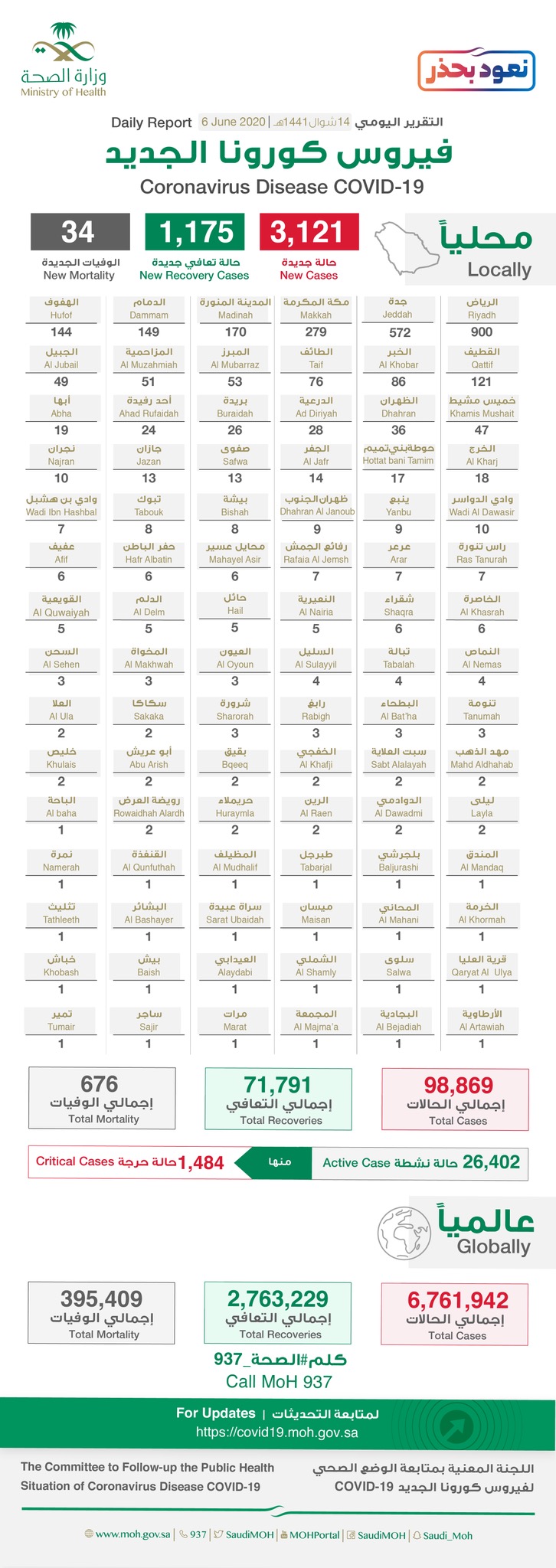 وأعلنت الوزارة تسجيل 34 حالة وفاة جديدة بينها حالة في القطيف، ليصل عدد الوفيات الكلي إلى 676 حالة وفاة.