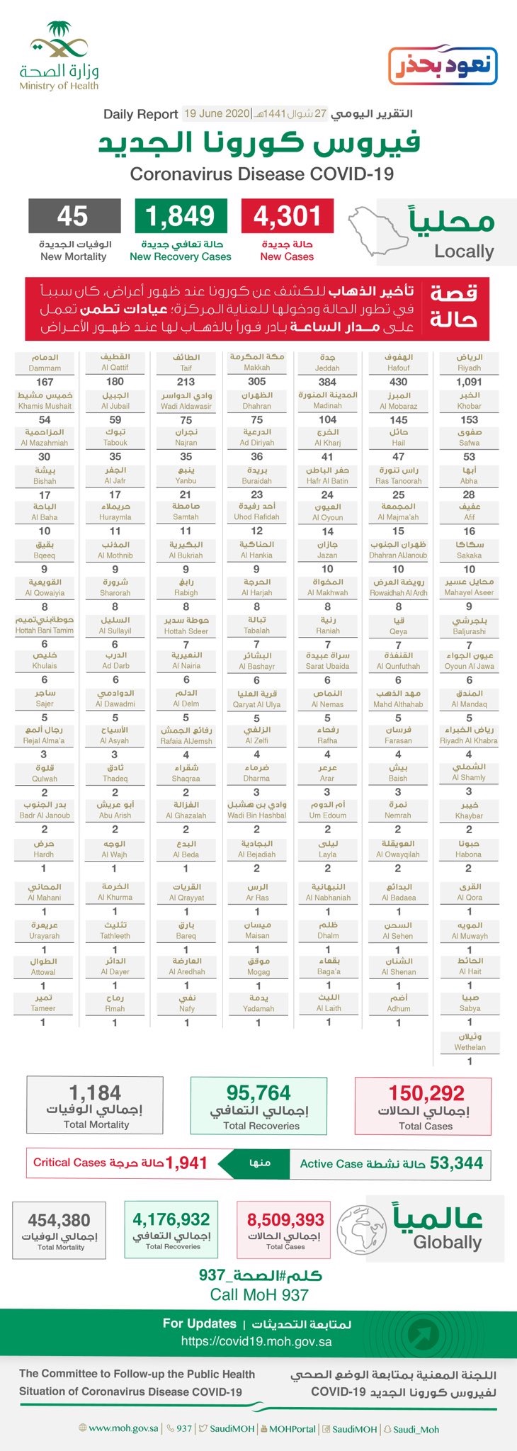 أعلنت وزارة الصحة، اليوم الجمعة، تسجيل 4301 إصابة جديدة بفيروس ”كورونا“ المستجد ”كوفيد - 19“ في المملكة. منها 180 في القطيف و53 بصفوى.